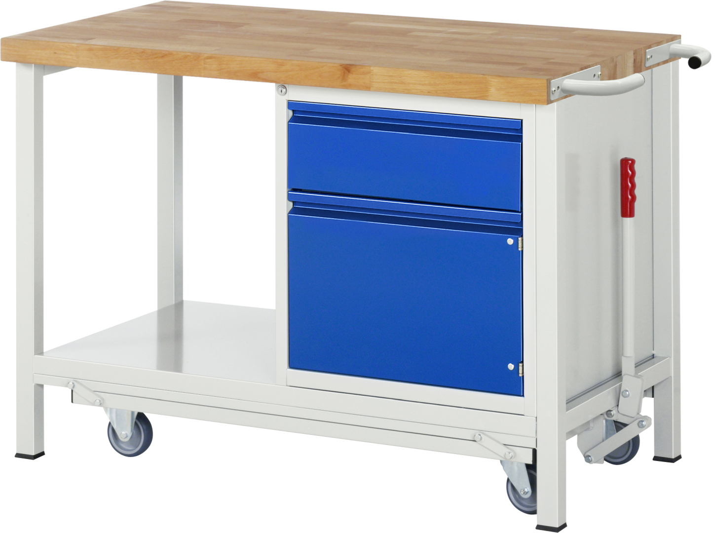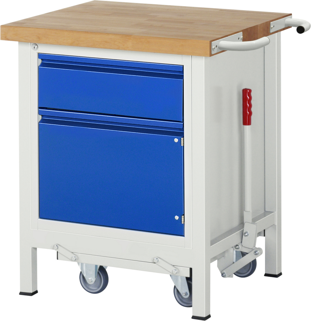- 4-Fuß Schweißgestell mit zwei Gestellfußpaaren aus Profil-Stahlrohr (45x45x2 mm) inkl. Tiefenverstrebungen (oben und unten). Gestellfüße unten mit Abschlusselement inkl. Anti-Rutsch-Noppe für sicheren Stand. Untergebautes Fahrgestell mit Excenterhebel (rechts). Bedienung des Excenterhebels nur bis Zuladung von max. 300 kg möglich. Das Fahrgestell lässt sich mit dem Excenterhebel ein- und ausfahren. Im ausgefahrenen Zustand beträgt die Höhe der Werkbank 910 mm. Fahrgestell mit 2 Bock- und 2 Lenkrollen (Rollendurchmesser 100 mm, Bauhöhe 125 mm, Laufbelag aus thermoplastischem Gummi (spurlos, 85 ° Shore), Radkörper aus Polypropylen). Bockrollen sind an der linken Seite, Lenkrollen an der rechten Seite montiert (Radplattenbefestigung). Querstreben aus C-Profil (40x40x2 mm) oben unter der Arbeitsplatte (vorne, hinten) sowie Ablageboden unten (Tiefe 650 mm hinten bündig mit Systemunterbau, Fachhöhe 580 mm).