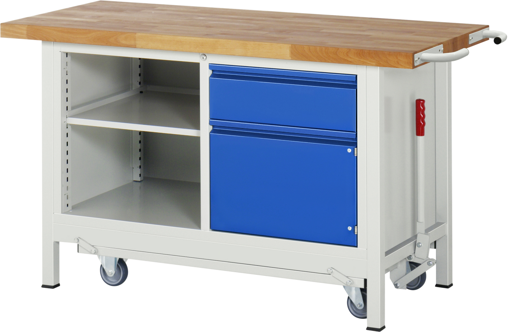 - 4-Fuß Schweißgestell mit zwei Gestellfußpaaren aus Profil-Stahlrohr (45x45x2 mm) inkl. Tiefenverstrebungen (oben und unten). Gestellfüße unten mit Abschlusselement inkl. Anti-Rutsch-Noppe für sicheren Stand. Untergebautes Fahrgestell mit Excenterhebel (rechts). Bedienung des Excenterhebels nur bis Zuladung von max. 300 kg möglich. Das Fahrgestell lässt sich mit dem Excenterhebel ein- und ausfahren. Im ausgefahrenen Zustand beträgt die Höhe der Werkbank 910 mm. Fahrgestell mit 2 Bock- und 2 Lenkrollen (Rollendurchmesser 100 mm, Bauhöhe 125 mm, Laufbelag aus thermoplastischem Gummi (spurlos, 85 ° Shore), Radkörper aus Polypropylen). Bockrollen sind an der linken Seite, Lenkrollen an der rechten Seite montiert (Radplattenbefestigung). Querstreben aus C-Profil (40x40x2 mm) oben unter der Arbeitsplatte (vorne, hinten) sowie Ablageboden unten (Tiefe 650 mm hinten bündig mit Systemunterbau, Fachhöhe 580 mm).