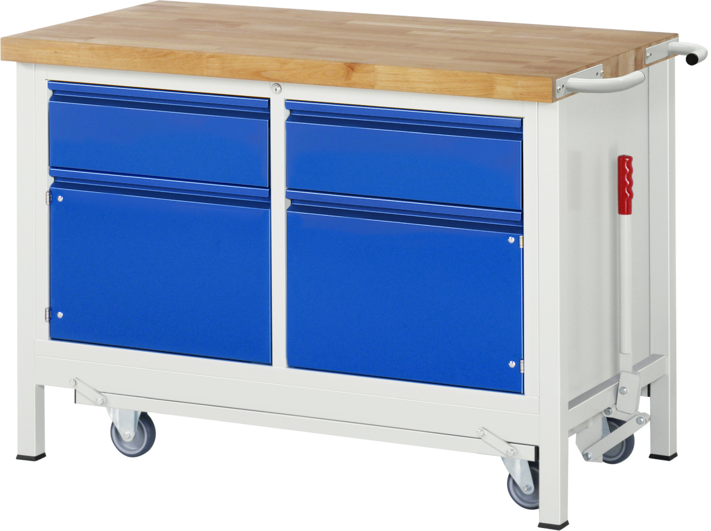 - 4-Fuß Schweißgestell mit zwei Gestellfußpaaren aus Profil-Stahlrohr (45x45x2 mm) inkl. Tiefenverstrebungen (oben und unten). Gestellfüße unten mit Abschlusselement inkl. Anti-Rutsch-Noppe für sicheren Stand. Untergebautes Fahrgestell mit Excenterhebel (rechts). Bedienung des Excenterhebels nur bis Zuladung von max. 300 kg möglich. Das Fahrgestell lässt sich mit dem Excenterhebel ein- und ausfahren. Im ausgefahrenen Zustand beträgt die Höhe der Werkbank 910 mm. Fahrgestell mit 2 Bock- und 2 Lenkrollen (Rollendurchmesser 100 mm, Bauhöhe 125 mm, Laufbelag aus thermoplastischem Gummi (spurlos, 85 ° Shore), Radkörper aus Polypropylen). Bockrollen sind an der linken Seite, Lenkrollen an der rechten Seite montiert (Radplattenbefestigung). Querstreben aus C-Profil (40x40x2 mm) oben unter der Arbeitsplatte (vorne, hinten) sowie Ablageboden unten (Tiefe 650 mm hinten bündig mit Systemunterbau, Fachhöhe 580 mm).