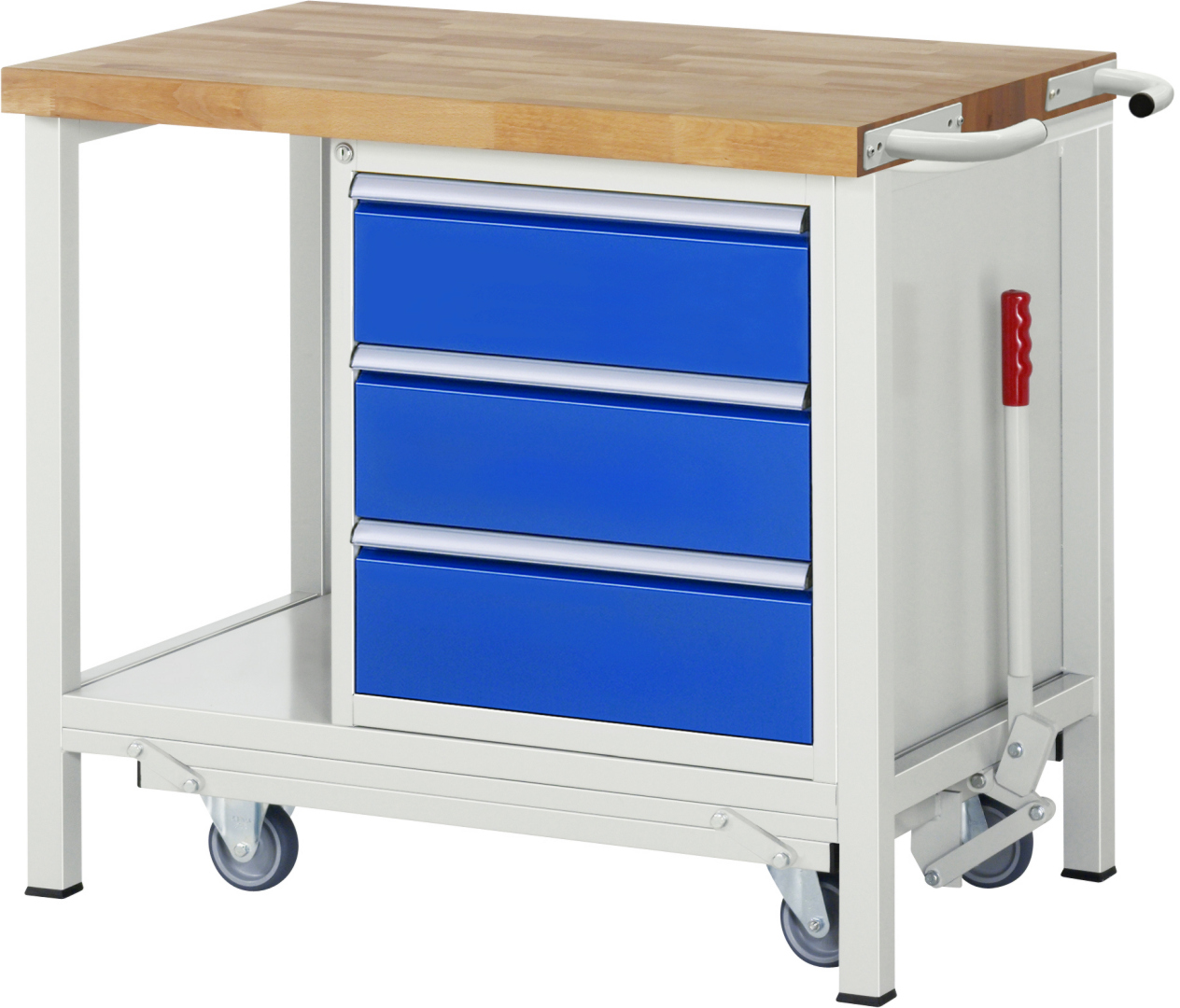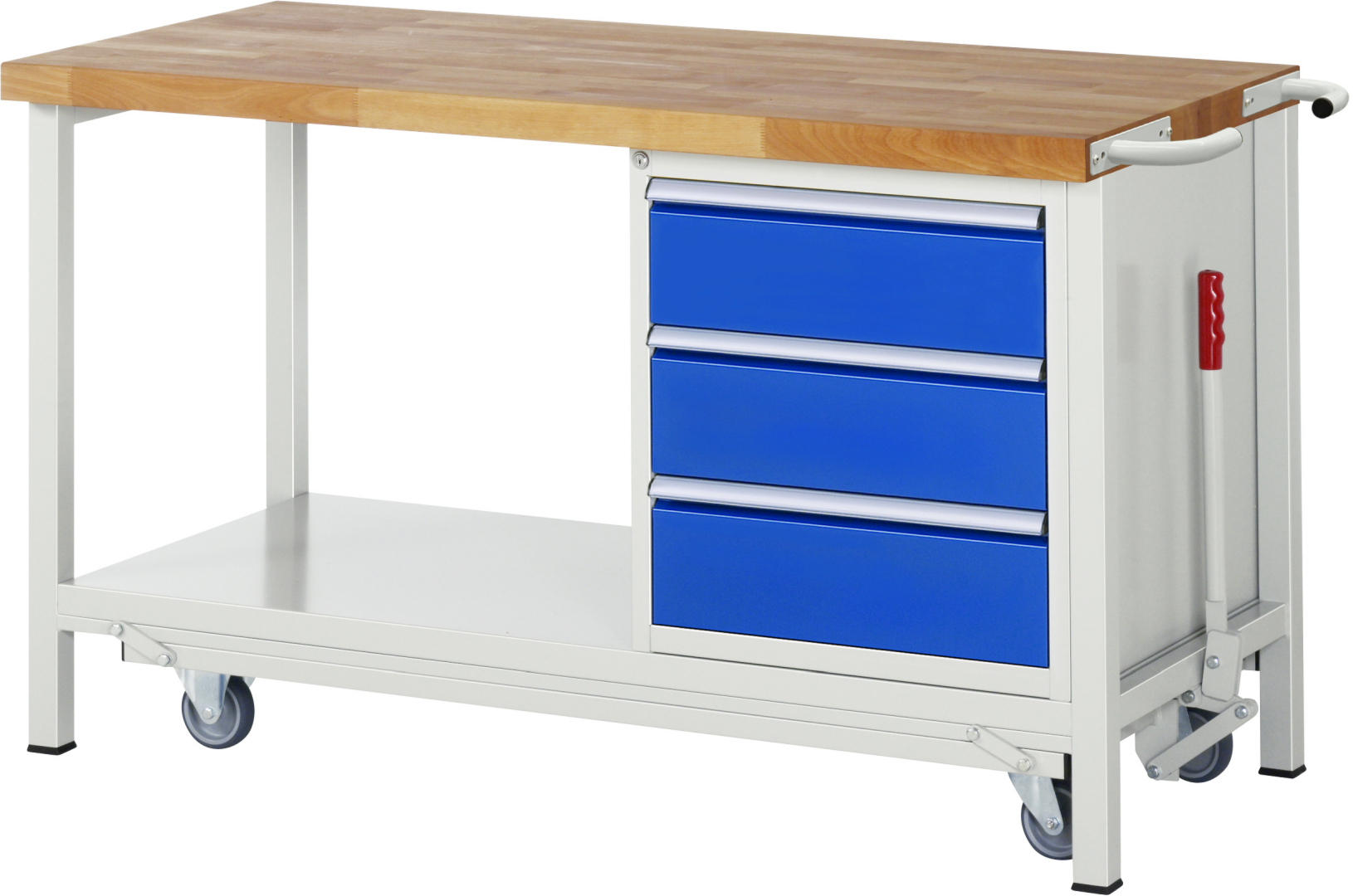 - 4-Fuß Schweißgestell mit zwei Gestellfußpaaren aus Profil-Stahlrohr (45x45x2 mm) inkl. Tiefenverstrebungen (oben und unten). Gestellfüße unten mit Abschlusselement inkl. Anti-Rutsch-Noppe für sicheren Stand. Untergebautes Fahrgestell mit Excenterhebel (rechts). Bedienung des Excenterhebels nur bis Zuladung von max. 300 kg möglich. Das Fahrgestell lässt sich mit dem Excenterhebel ein- und ausfahren. Im ausgefahrenen Zustand beträgt die Höhe der Werkbank 910 mm. Fahrgestell mit 2 Bock- und 2 Lenkrollen (Rollendurchmesser 100 mm, Bauhöhe 125 mm, Laufbelag aus thermoplastischem Gummi (spurlos, 85 ° Shore), Radkörper aus Polypropylen). Bockrollen sind an der linken Seite, Lenkrollen an der rechten Seite montiert (Radplattenbefestigung). Querstreben aus C-Profil (40x40x2 mm) oben unter der Arbeitsplatte (vorne, hinten) sowie Ablageboden unten (Tiefe 650 mm hinten bündig mit Systemunterbau, Fachhöhe 580 mm).