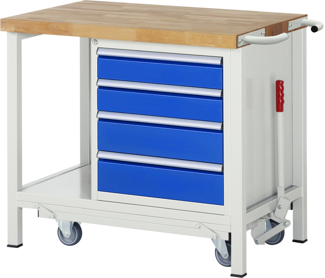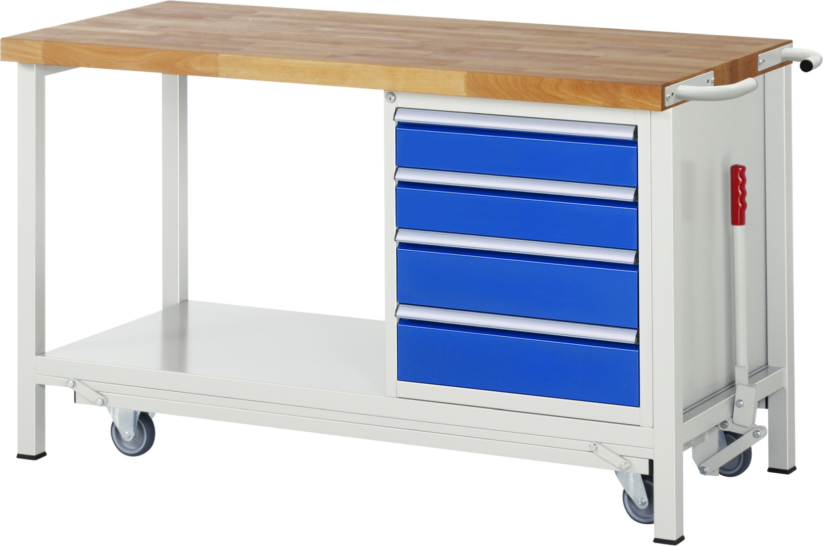 - 4-Fuß Schweißgestell mit zwei Gestellfußpaaren aus Profil-Stahlrohr (45x45x2 mm) inkl. Tiefenverstrebungen (oben und unten). Gestellfüße unten mit Abschlusselement inkl. Anti-Rutsch-Noppe für sicheren Stand. Untergebautes Fahrgestell mit Excenterhebel (rechts). Bedienung des Excenterhebels nur bis Zuladung von max. 300 kg möglich. Das Fahrgestell lässt sich mit dem Excenterhebel ein- und ausfahren. Im ausgefahrenen Zustand beträgt die Höhe der Werkbank 910 mm. Fahrgestell mit 2 Bock- und 2 Lenkrollen (Rollendurchmesser 100 mm, Bauhöhe 125 mm, Laufbelag aus thermoplastischem Gummi (spurlos, 85 ° Shore), Radkörper aus Polypropylen). Bockrollen sind an der linken Seite, Lenkrollen an der rechten Seite montiert (Radplattenbefestigung). Querstreben aus C-Profil (40x40x2 mm) oben unter der Arbeitsplatte (vorne, hinten) sowie Ablageboden unten (Tiefe 650 mm hinten bündig mit Systemunterbau, Fachhöhe 580 mm).