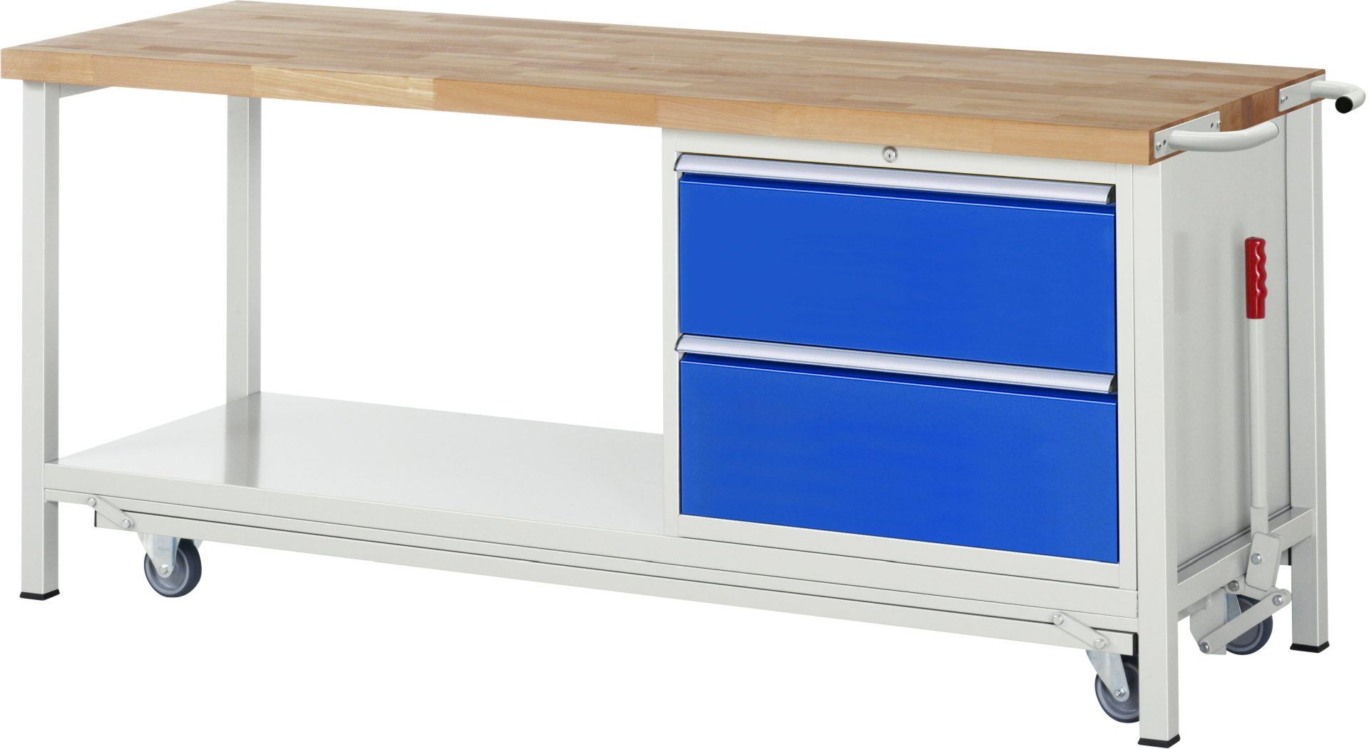 - 4-Fuß Schweißgestell mit zwei Gestellfußpaaren aus Profil-Stahlrohr (45x45x2 mm) inkl. Tiefenverstrebungen (oben und unten). Gestellfüße unten mit Abschlusselement inkl. Anti-Rutsch-Noppe für sicheren Stand. Untergebautes Fahrgestell mit Excenterhebel (rechts). Bedienung des Excenterhebels nur bis Zuladung von max. 300 kg möglich. Das Fahrgestell lässt sich mit dem Excenterhebel ein- und ausfahren. Im ausgefahrenen Zustand beträgt die Höhe der Werkbank 910 mm. Fahrgestell mit 2 Bock- und 2 Lenkrollen (Rollendurchmesser 100 mm, Bauhöhe 125 mm, Laufbelag aus thermoplastischem Gummi (spurlos, 85 ° Shore), Radkörper aus Polypropylen). Bockrollen sind an der linken Seite, Lenkrollen an der rechten Seite montiert (Radplattenbefestigung). Querstreben aus C-Profil (40x40x2 mm) oben unter der Arbeitsplatte (vorne, hinten) sowie Ablageboden unten (Tiefe 650 mm hinten bündig mit Systemunterbau, Fachhöhe 580 mm).