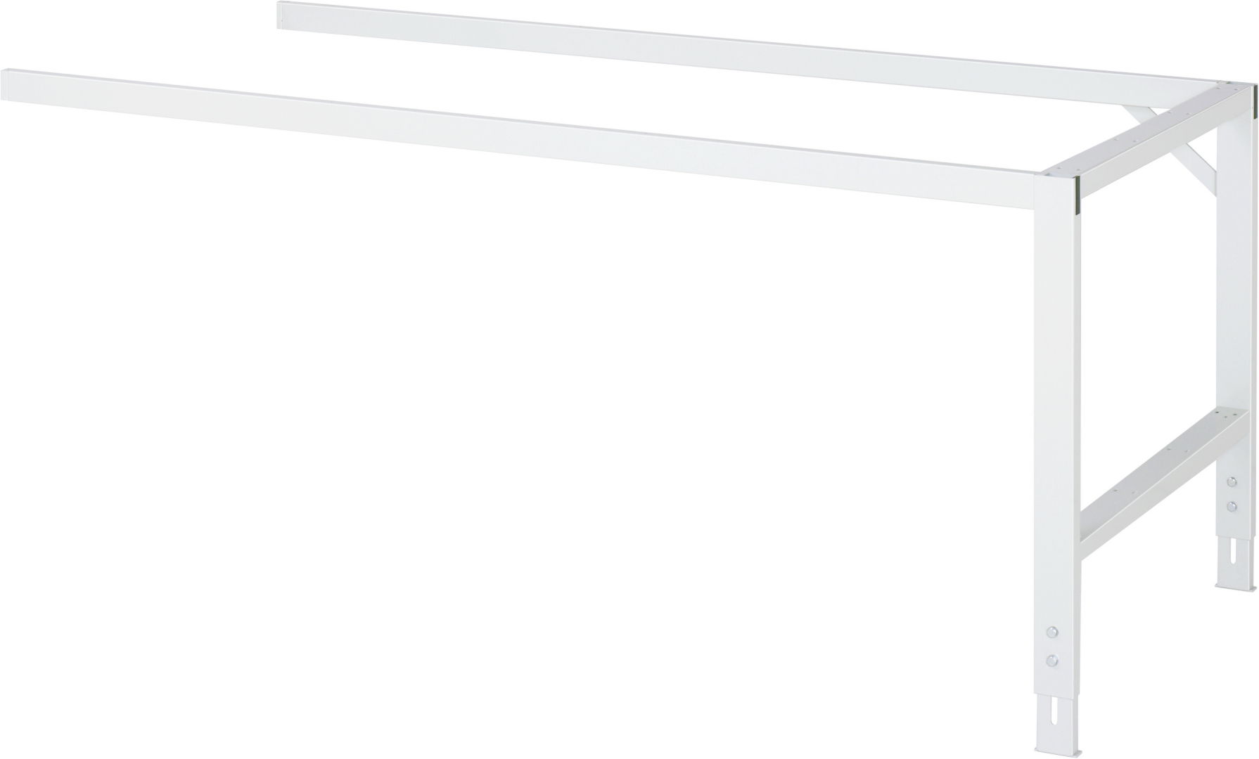 - 2-Fuß Gestell mit einem Gestellfußpaar aus Profil-Stahlrohr (60x30x2 mm) inkl. Tiefenverstrebungen (oben und unten). Gestellfuß unten mit Abschlusselement inkl. Höheneinstellung. Querstreben aus Profil-Stahlrohr (50x25x2 mm) oben unter der Arbeitsplatte (vorne und hinten). Aussteifungstraverse hinten als Verbindung zwischen Gestellfußpaar und hinterer Querstrebe. Die Gestellfüße sind vorbereitet für die Aufnahme/Nachrüstung eines Rollensatzes.