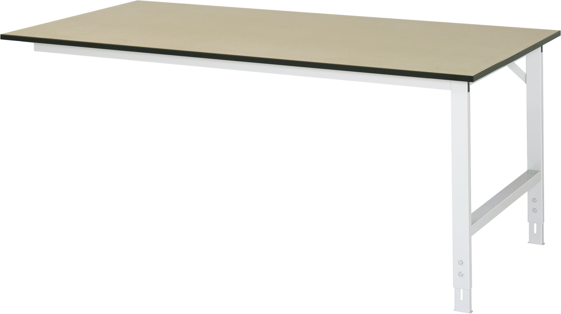 - 2-Fuß Gestell mit einem Gestellfußpaar aus Profil-Stahlrohr (60x30x2 mm) inkl. Tiefenverstrebungen (oben und unten). Gestellfuß unten mit Abschlusselement inkl. Höheneinstellung. Querstreben aus Profil-Stahlrohr (50x25x2 mm) oben unter der Arbeitsplatte (vorne und hinten). Aussteifungstraverse hinten als Verbindung zwischen Gestellfußpaar und hinterer Querstrebe. Die Gestellfüße sind vorbereitet für die Aufnahme/Nachrüstung eines Rollensatzes.