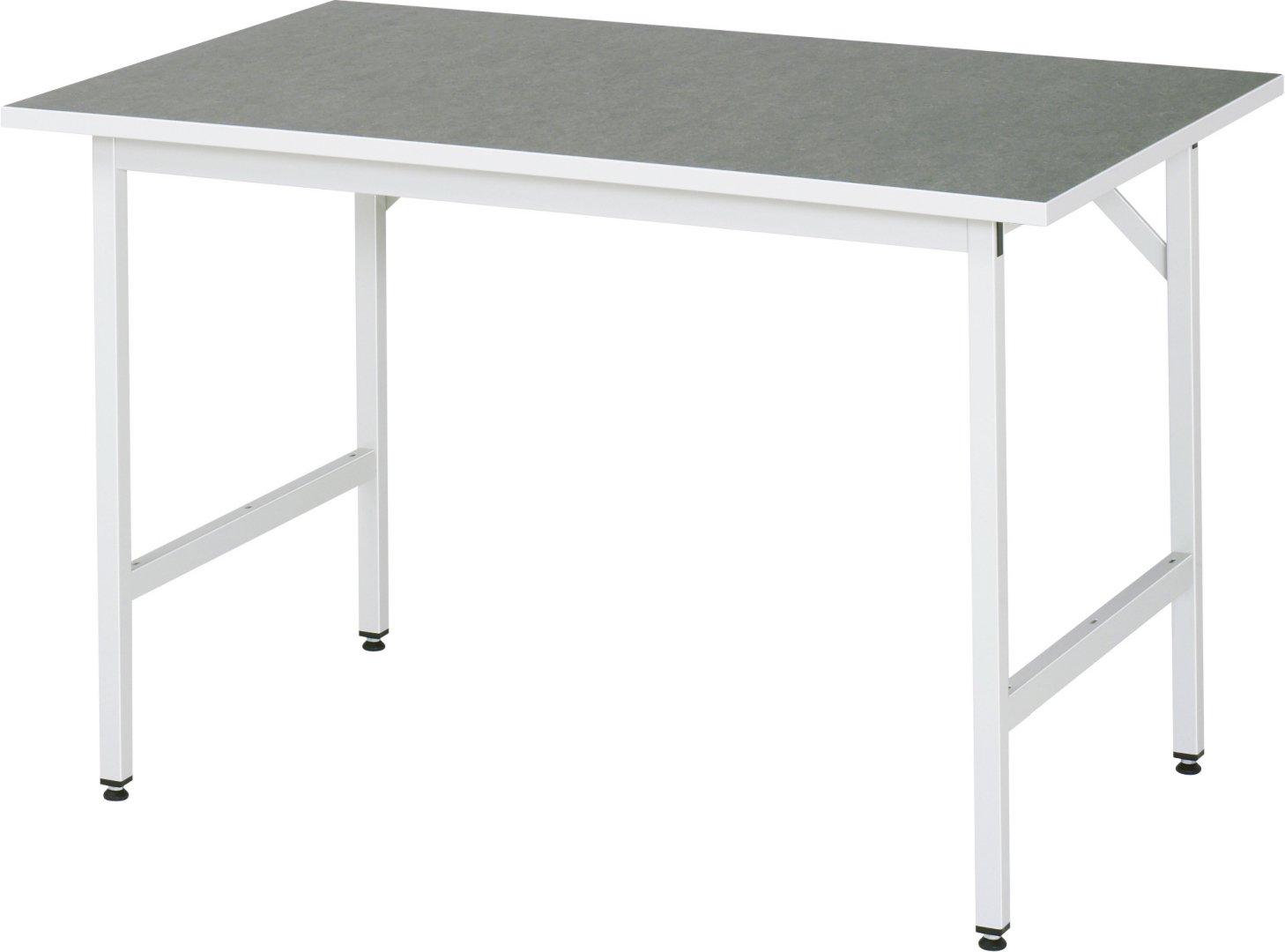 - 4-Fuß Gestell mit zwei Gestellfußpaaren aus Profil-Stahlrohr (30x30x2 mm) inkl. Tiefenverstrebungen (oben und unten).Gestellfüße unten mit Abschlusselement inkl. Höheneinstellung. Querstreben aus Profil-Stahlrohr (50x25x2 mm) oben unter der Arbeitsplatte (vorne und hinten). Aussteifungstraversen hinten (links und rechts) als Verbindung zwischen Gestellfußpaar und hinterer Querstrebe. Die Gestellfüße sind vorbereitet für die Aufnahme/Nachrüstung eines Rollensatzes.