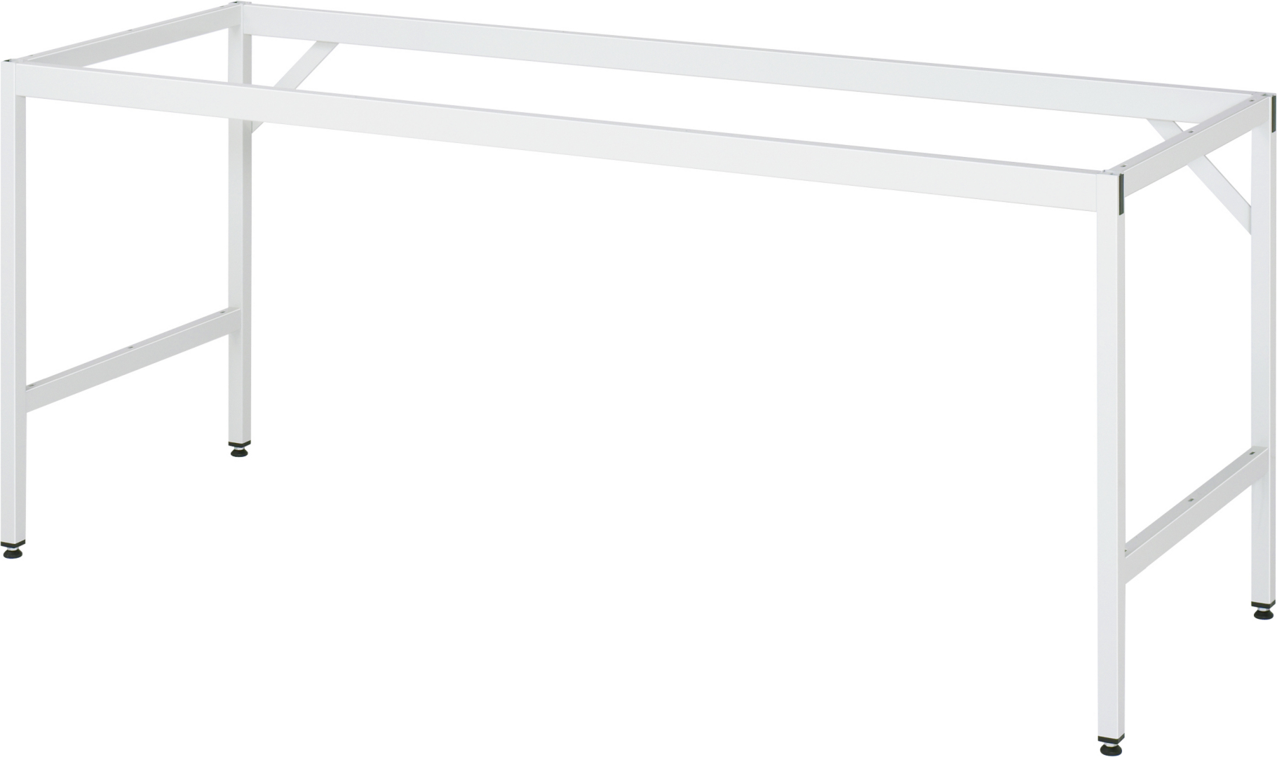 - 4-Fuß Gestell mit zwei Gestellfußpaaren aus Profil-Stahlrohr (30x30x2 mm) inkl. Tiefenverstrebungen (oben und unten).Gestellfüße unten mit Abschlusselement inkl. Höheneinstellung. Querstreben aus Profil-Stahlrohr (50x25x2 mm) oben unter der Arbeitsplatte (vorne und hinten). Aussteifungstraversen hinten (links und rechts) als Verbindung zwischen Gestellfußpaar und hinterer Querstrebe. Die Gestellfüße sind vorbereitet für die Aufnahme/Nachrüstung eines Rollensatzes.