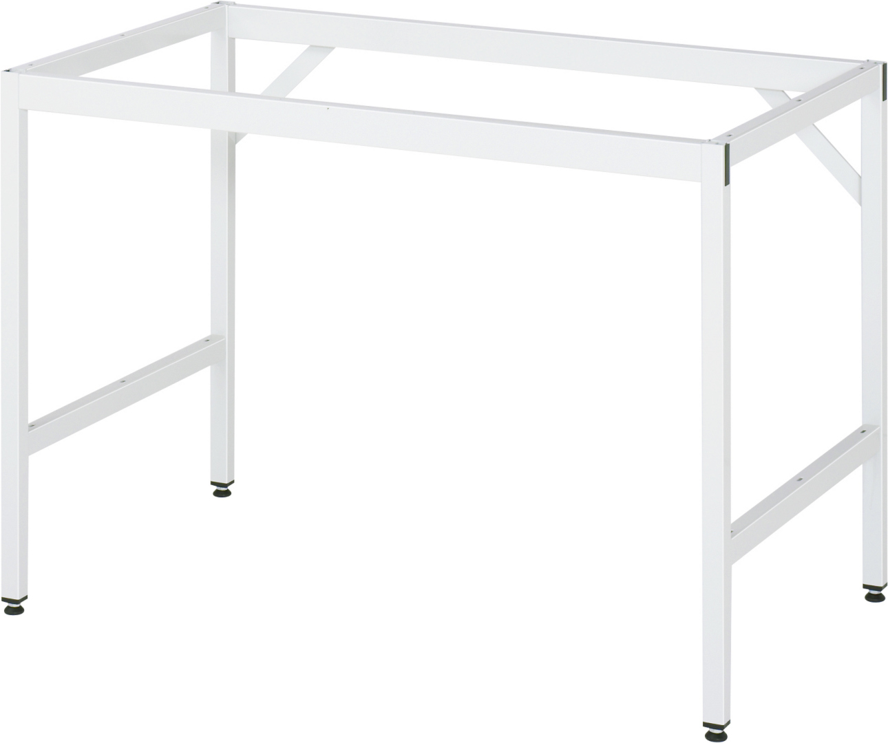 - 4-Fuß Gestell mit zwei Gestellfußpaaren aus Profil-Stahlrohr (30x30x2 mm) inkl. Tiefenverstrebungen (oben und unten).Gestellfüße unten mit Abschlusselement inkl. Höheneinstellung. Querstreben aus Profil-Stahlrohr (50x25x2 mm) oben unter der Arbeitsplatte (vorne und hinten). Aussteifungstraversen hinten (links und rechts) als Verbindung zwischen Gestellfußpaar und hinterer Querstrebe. Die Gestellfüße sind vorbereitet für die Aufnahme/Nachrüstung eines Rollensatzes.