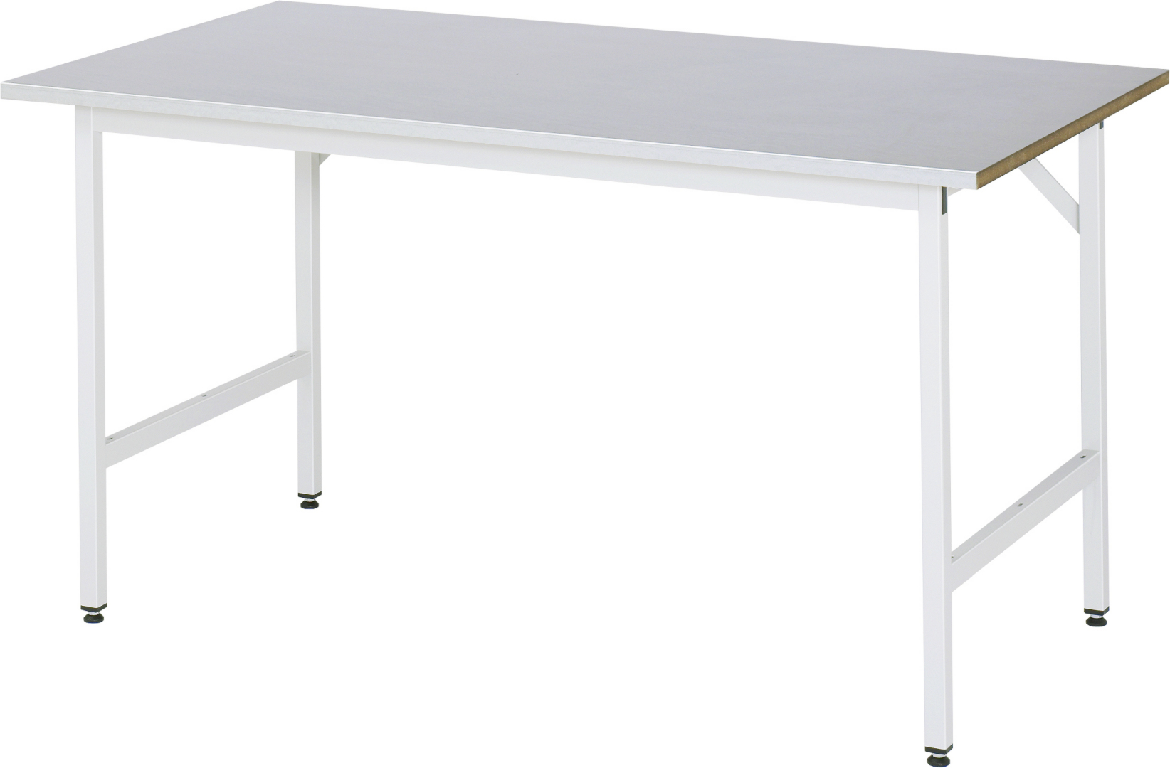 - 4-Fuß Gestell mit zwei Gestellfußpaaren aus Profil-Stahlrohr (30x30x2 mm) inkl. Tiefenverstrebungen (oben und unten).Gestellfüße unten mit Abschlusselement inkl. Höheneinstellung. Querstreben aus Profil-Stahlrohr (50x25x2 mm) oben unter der Arbeitsplatte (vorne und hinten). Aussteifungstraversen hinten (links und rechts) als Verbindung zwischen Gestellfußpaar und hinterer Querstrebe. Die Gestellfüße sind vorbereitet für die Aufnahme/Nachrüstung eines Rollensatzes.