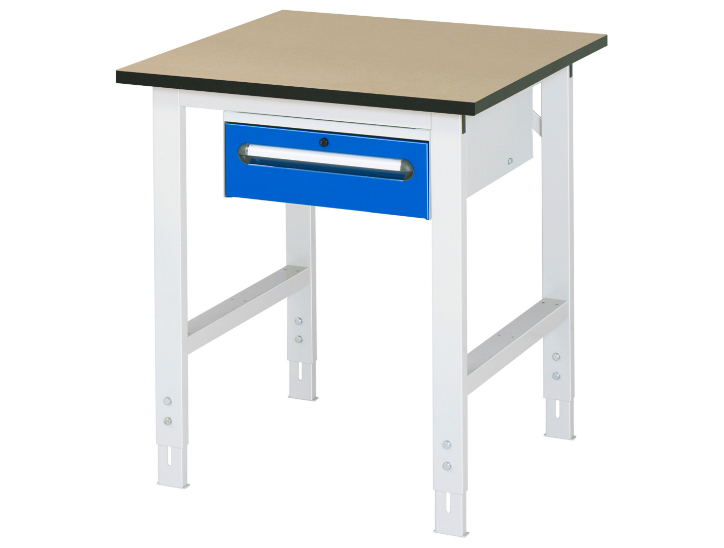 - 4-Fuß Gestell mit zwei Gestellfußpaaren aus Profil-Stahlrohr (60x30x2 mm) inkl. Tiefenverstrebungen (oben und unten). Gestellfüße unten mit Abschlusselement inkl. Höheneinstellung. Querstreben aus Profil-Stahlrohr (50x25x2 mm) oben unter der Arbeitsplatte (vorne und hinten). Aussteifungstraversen hinten (links, mittig und rechts) als Verbindung zwischen Gestellfußpaar und hinterer Querstrebe. Die Gestellfüße sind vorbereitet für die Aufnahme/Nachrüstung eines Rollensatzes.
