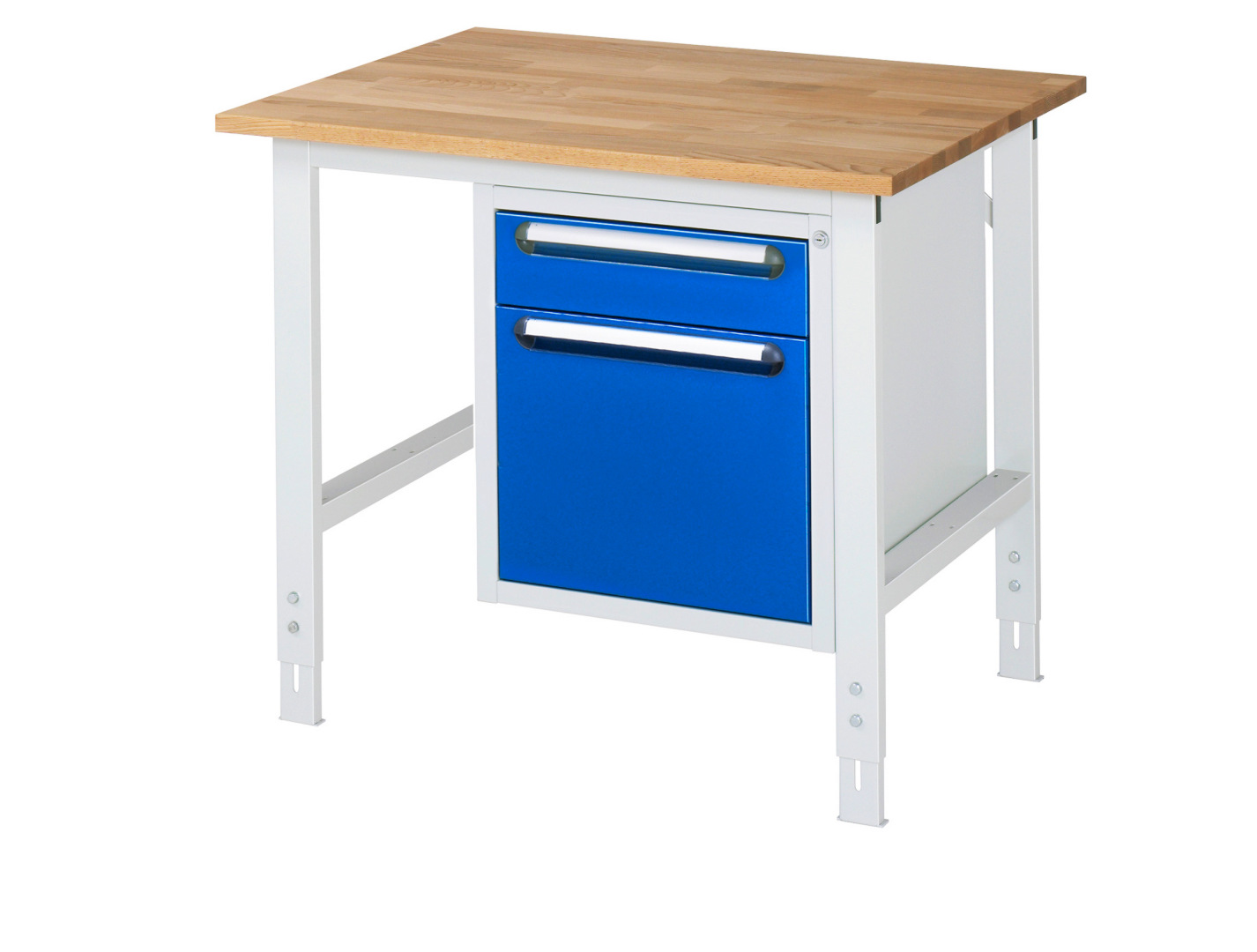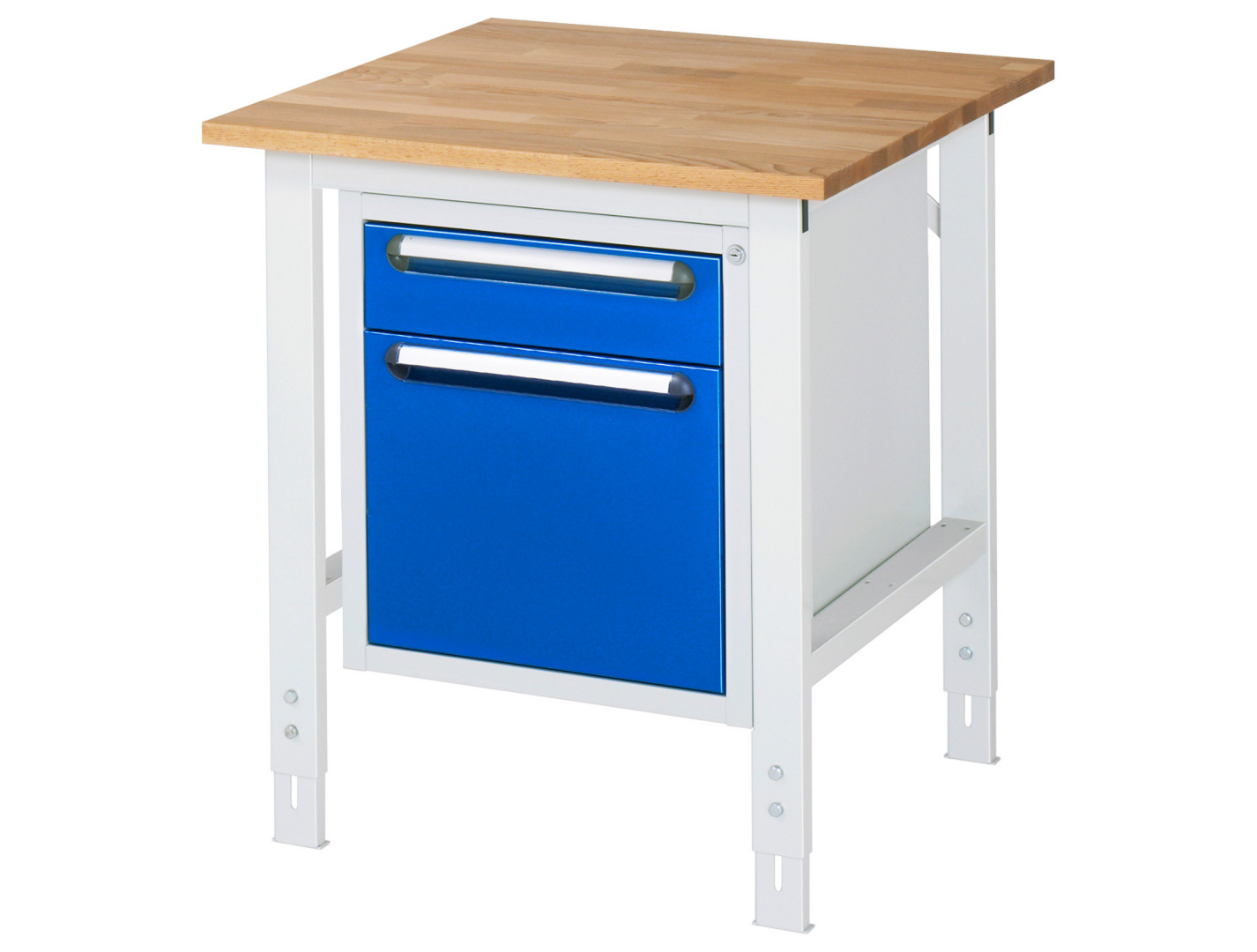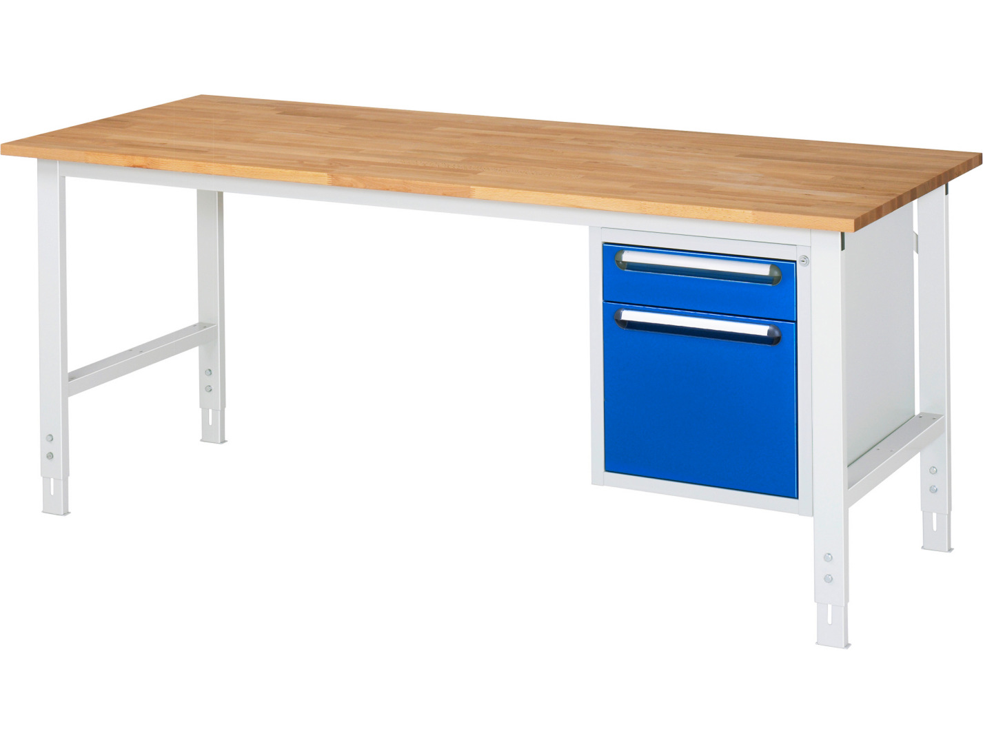 - 4-Fuß Gestell mit zwei Gestellfußpaaren aus Profil-Stahlrohr (60x30x2 mm) inkl. Tiefenverstrebungen (oben und unten). Gestellfüße unten mit Abschlusselement inkl. Höheneinstellung. Querstreben aus Profil-Stahlrohr (50x25x2 mm) oben unter der Arbeitsplatte (vorne und hinten). Aussteifungstraversen hinten (links und rechts) als Verbindung zwischen Gestellfußpaar und hinterer Querstrebe. Die Gestellfüße sind vorbereitet für die Aufnahme/Nachrüstung eines Rollensatzes.
