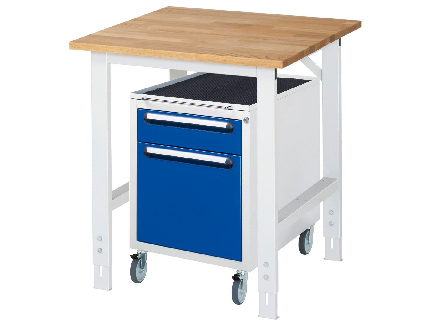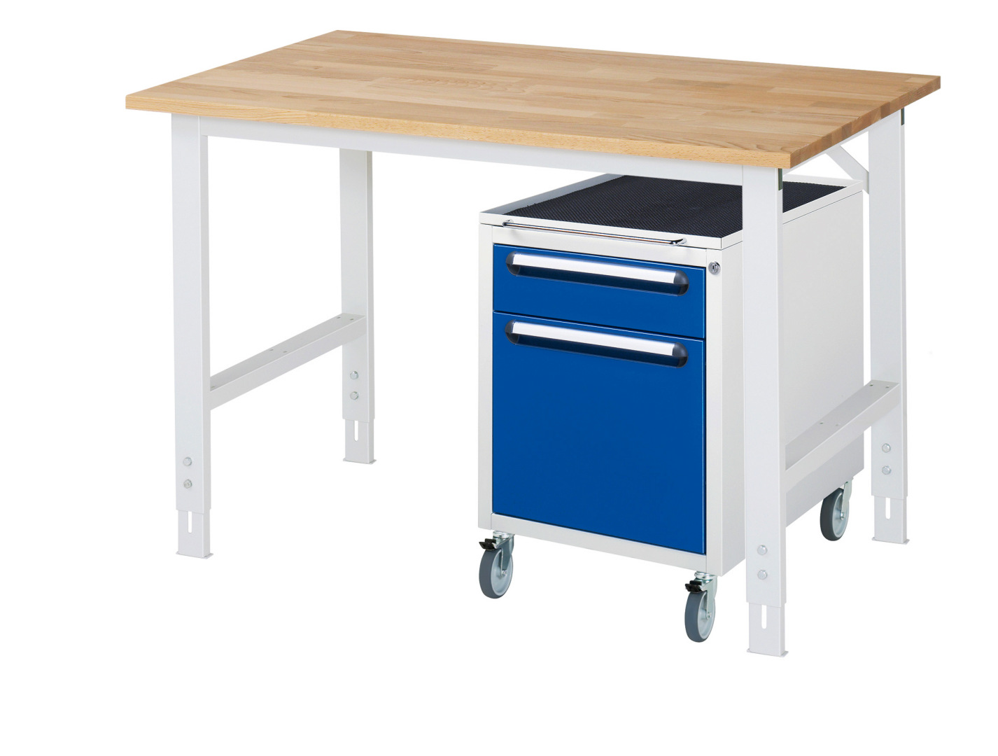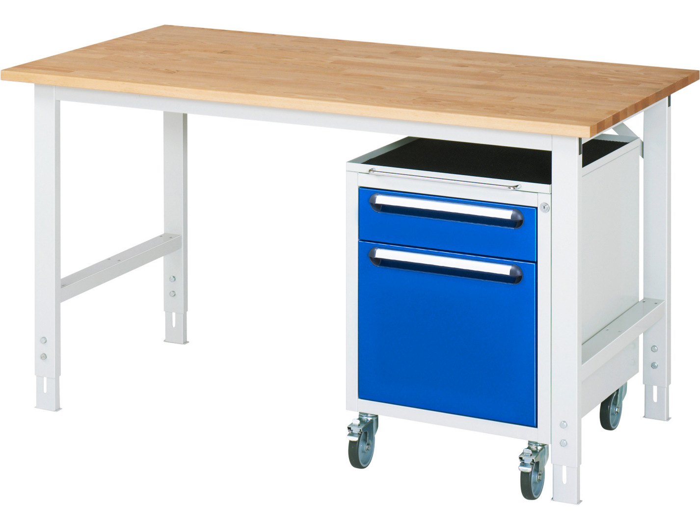 - 4-Fuß Gestell mit zwei Gestellfußpaaren aus Profil-Stahlrohr (60x30x2 mm) inkl. Tiefenverstrebungen (oben und unten). Gestellfüße unten mit Abschlusselement inkl. Höheneinstellung. Querstreben aus Profil-Stahlrohr (50x25x2 mm) oben unter der Arbeitsplatte (vorne und hinten). Aussteifungstraversen hinten (links und rechts) als Verbindung zwischen Gestellfußpaar und hinterer Querstrebe. Die Gestellfüße sind vorbereitet für die Aufnahme/Nachrüstung eines Rollensatzes.