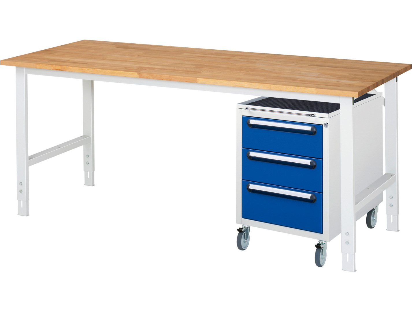 - mit Roll-Container E (B490xT600xH690mm, Schloss mit 2 Schlüsseln und Zentralverschluß) mit 3 x Schublade 2x150, 1x180 mm.