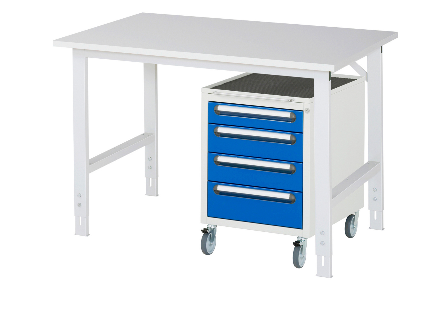- 4-Fuß Gestell mit zwei Gestellfußpaaren aus Profil-Stahlrohr (60x30x2 mm) inkl. Tiefenverstrebungen (oben und unten). Gestellfüße unten mit Abschlusselement inkl. Höheneinstellung. Querstreben aus Profil-Stahlrohr (50x25x2 mm) oben unter der Arbeitsplatte (vorne und hinten). Aussteifungstraversen hinten (links, mittig und rechts) als Verbindung zwischen Gestellfußpaar und hinterer Querstrebe. Die Gestellfüße sind vorbereitet für die Aufnahme/Nachrüstung eines Rollensatzes.