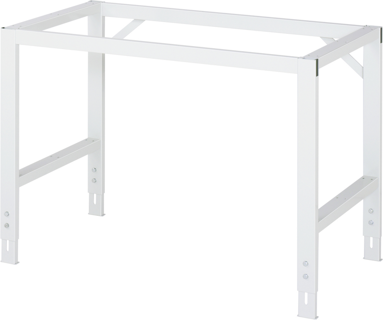- 4-Fuß Gestell mit zwei Gestellfußpaaren aus Profil-Stahlrohr (60x30x2 mm) inkl. Tiefenverstrebungen (oben und unten). Gestellfüße unten mit Abschlusselement inkl. Höheneinstellung. Querstreben aus Profil-Stahlrohr (50x25x2 mm) oben unter der Arbeitsplatte (vorne und hinten). Aussteifungstraversen hinten (links und rechts) als Verbindung zwischen Gestellfußpaar und hinterer Querstrebe. Die Gestellfüße sind vorbereitet für die Aufnahme/Nachrüstung eines Rollensatzes.