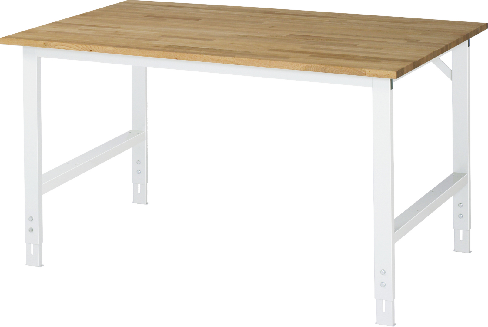 - 4-Fuß Gestell mit zwei Gestellfußpaaren aus Profil-Stahlrohr (60x30x2 mm) inkl. Tiefenverstrebungen (oben und unten). Gestellfüße unten mit Abschlusselement inkl. Höheneinstellung. Querstreben aus Profil-Stahlrohr (50x25x2 mm) oben unter der Arbeitsplatte (vorne und hinten). Aussteifungstraversen hinten (links und rechts) als Verbindung zwischen Gestellfußpaar und hinterer Querstrebe. Die Gestellfüße sind vorbereitet für die Aufnahme/Nachrüstung eines Rollensatzes.