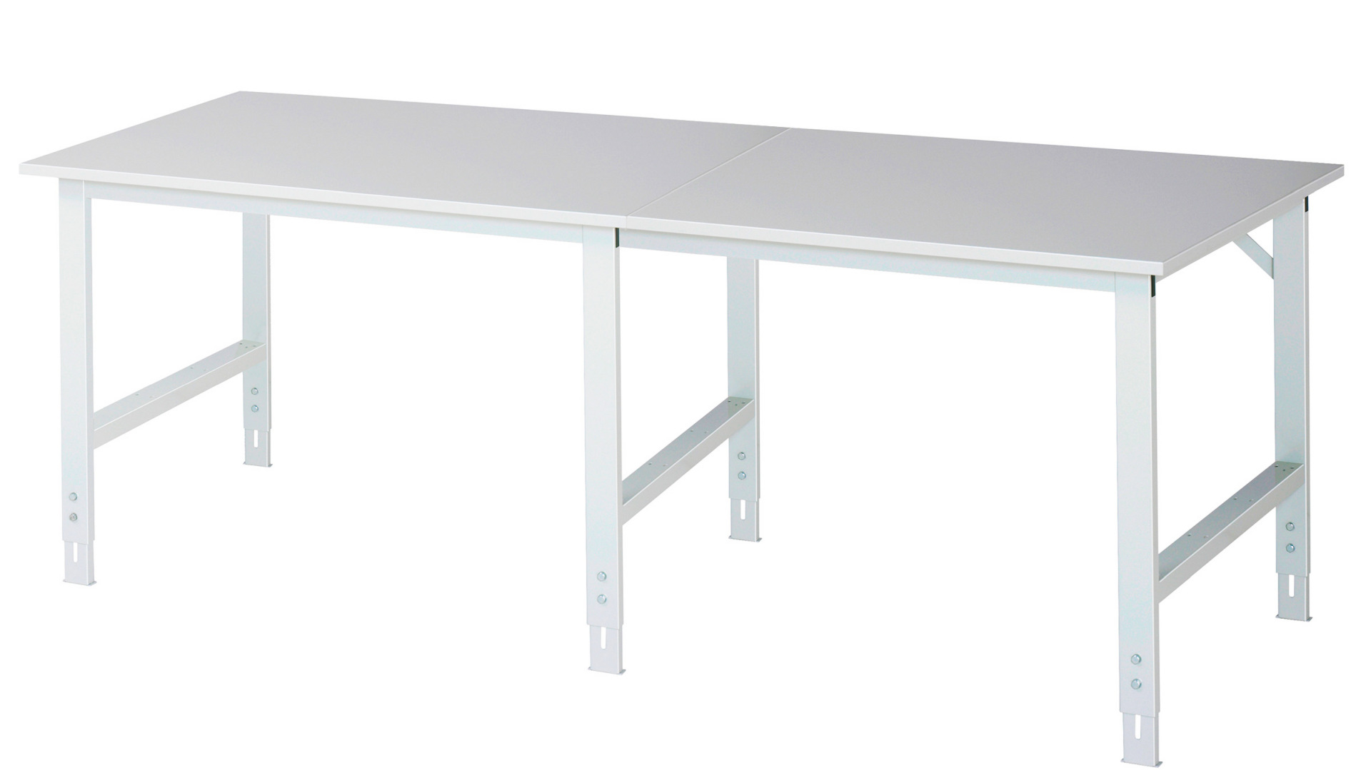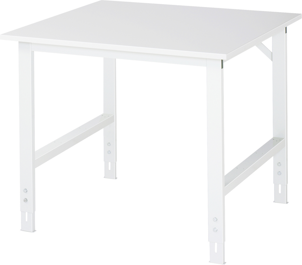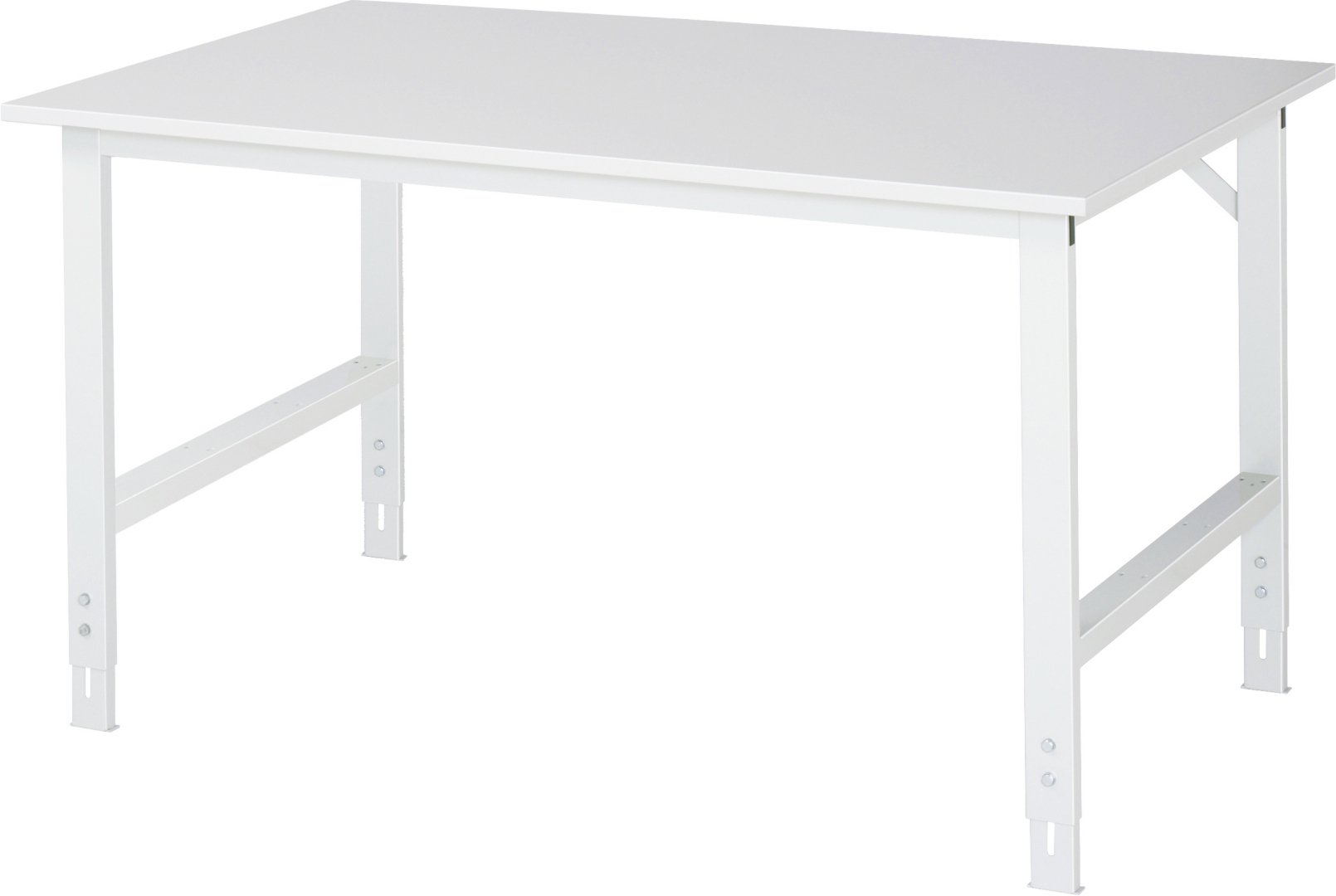 - 4-Fuß Gestell mit zwei Gestellfußpaaren aus Profil-Stahlrohr (60x30x2 mm) inkl. Tiefenverstrebungen (oben und unten). Gestellfüße unten mit Abschlusselement inkl. Höheneinstellung. Querstreben aus Profil-Stahlrohr (50x25x2 mm) oben unter der Arbeitsplatte (vorne und hinten). Aussteifungstraversen hinten (links und rechts) als Verbindung zwischen Gestellfußpaar und hinterer Querstrebe. Die Gestellfüße sind vorbereitet für die Aufnahme/Nachrüstung eines Rollensatzes.