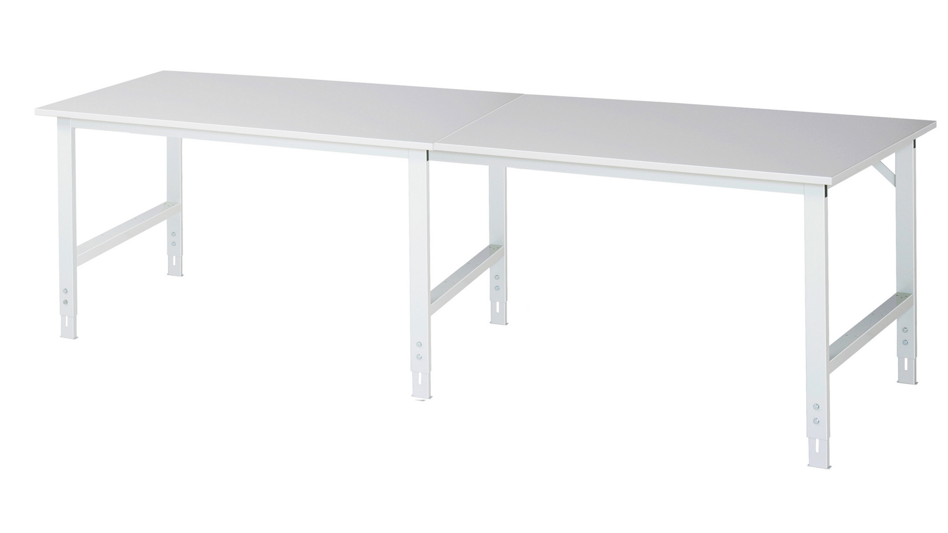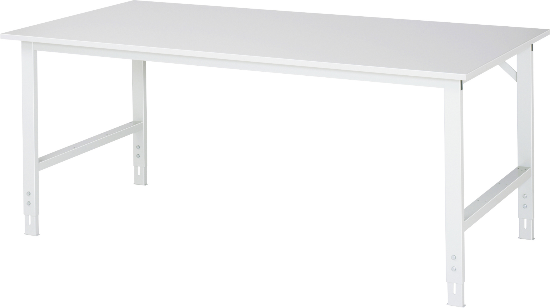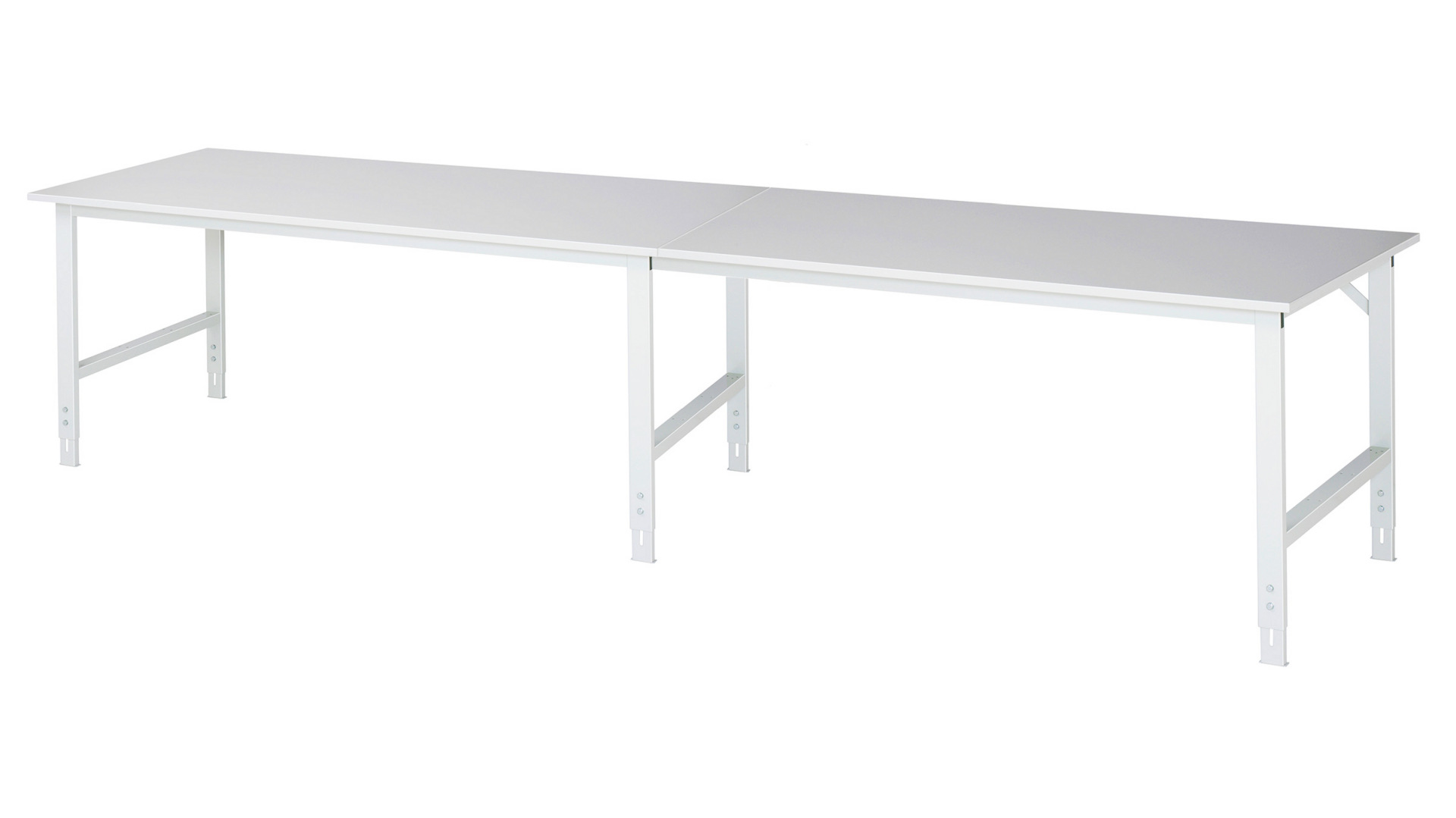 - 4-Fuß Gestell mit zwei Gestellfußpaaren aus Profil-Stahlrohr (60x30x2 mm) inkl. Tiefenverstrebungen (oben und unten). Gestellfüße unten mit Abschlusselement inkl. Höheneinstellung. Querstreben aus Profil-Stahlrohr (50x25x2 mm) oben unter der Arbeitsplatte (vorne und hinten). Aussteifungstraversen hinten (links und rechts) als Verbindung zwischen Gestellfußpaar und hinterer Querstrebe. Die Gestellfüße sind vorbereitet für die Aufnahme/Nachrüstung eines Rollensatzes.