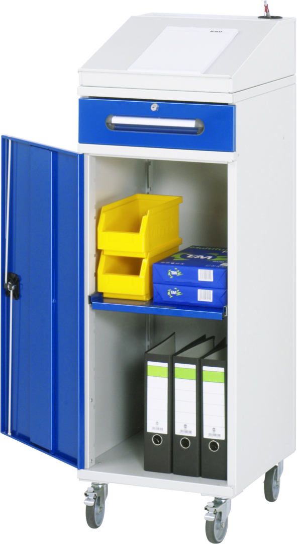 - Basisschrank geteilt in separat nutz- und bedienbares Klein- und Flügeltürfach, inkl. Rollensatz. Rollensatz mit 4 Lenkrollen, davon 2 mit Feststeller (Rollendurchmesser 100 mm, Bauhöhe 120 mm, Laufbelag aus thermoplastischem Gummi (grau, spurlos, 85° Shore), Radkörper aus Polypropylen). Befestigung mit Dreieck-Gewindeplatten. Kabeldurchlässe an der Schrankrückseite, im Deckel sowie im Innenteil.