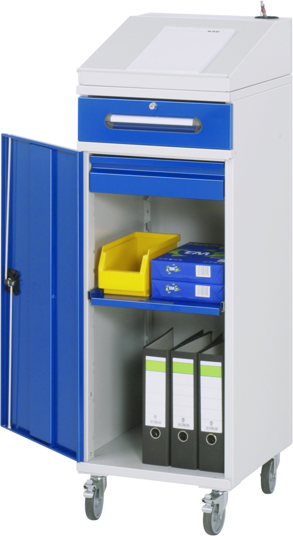 - Basisschrank geteilt in separat nutz- und bedienbares Klein- und Flügeltürfach, inkl. Rollensatz. Rollensatz mit 4 Lenkrollen, davon 2 mit Feststeller (Rollendurchmesser 100 mm, Bauhöhe 120 mm, Laufbelag aus thermoplastischem Gummi (grau, spurlos, 85° Shore), Radkörper aus Polypropylen). Befestigung mit Dreieck-Gewindeplatten. Kabeldurchlässe an der Schrankrückseite, im Deckel sowie im Innenteil.
