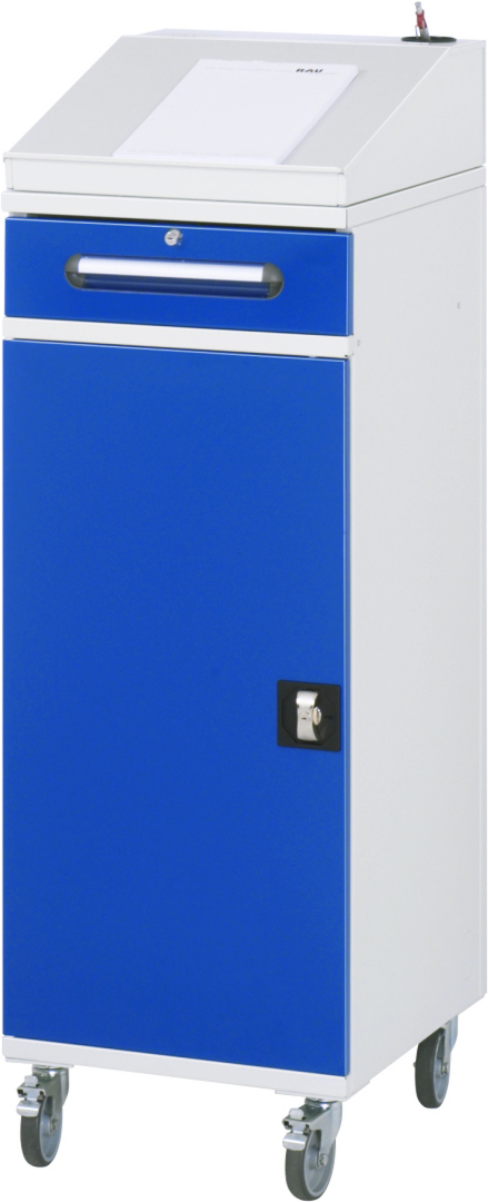 - Kleinfach (Höhe 120 mm) mit Schublade (abschließbar). Schublade B370 x T400 x H120 mm (Auszug 100 %, Tragkraft 35 kg, abschließbar), inkl. Beschriftungsstreifen.