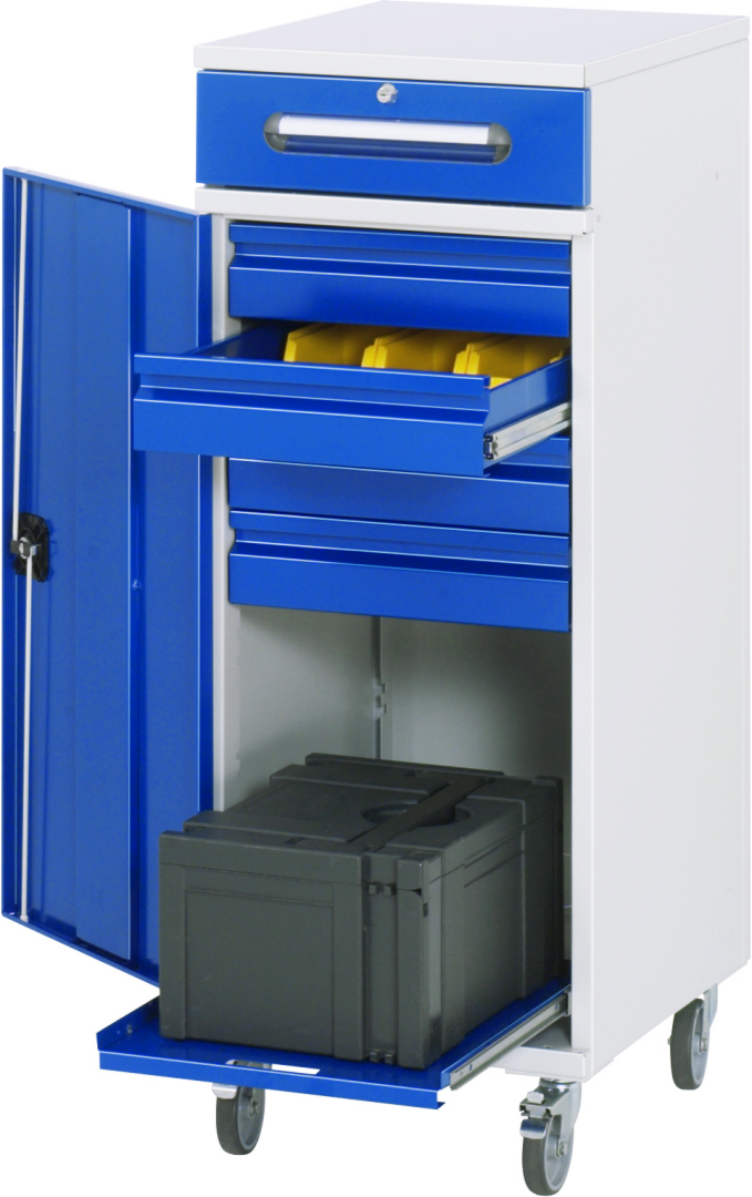 - Basisschrank geteilt in separat nutz- und bedienbares Klein- und Flügeltürfach, inkl. Rollensatz. Rollensatz mit 4 Lenkrollen, davon 2 mit Feststeller (Rollendurchmesser 100 mm, Bauhöhe 120 mm, Laufbelag aus thermoplastischem Gummi (grau, spurlos, 85° Shore), Radkörper aus Polypropylen). Befestigung mit Dreieck-Gewindeplatten. Kabeldurchlässe an der Schrankrückseite, im Deckel sowie im Innenteil.