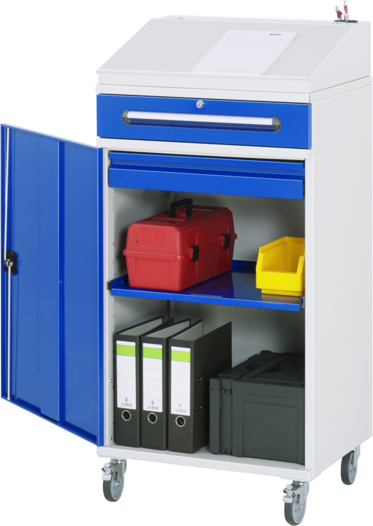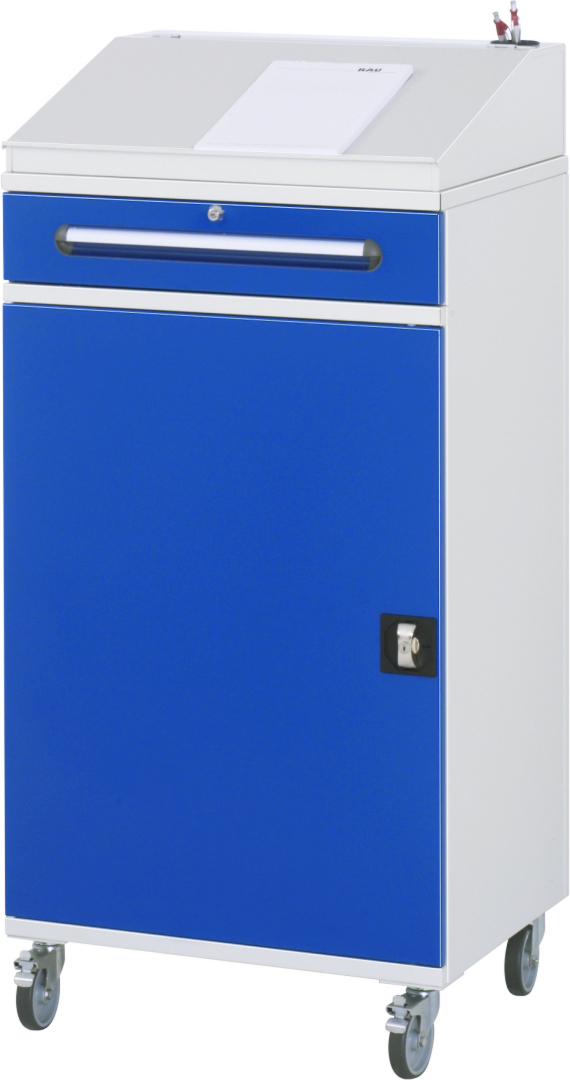 - Basisschrank geteilt in separat nutz- und bedienbares Klein- und Flügeltürfach, inkl. Rollensatz. Rollensatz mit 4 Lenkrollen, davon 2 mit Feststeller (Rollendurchmesser 100 mm, Bauhöhe 120 mm, Laufbelag aus thermoplastischem Gummi (grau, spurlos, 85° Shore), Radkörper aus Polypropylen). Befestigung mit Dreieck-Gewindeplatten. Kabeldurchlässe an der Schrankrückseite, im Deckel sowie im Innenteil.
