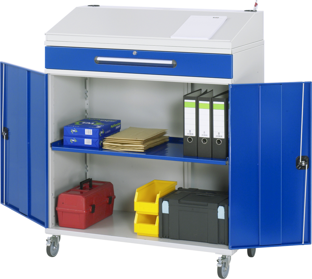 - Basisschrank geteilt in separat nutz- und bedienbares Klein- und Flügeltürfach, inkl. Rollensatz. Rollensatz mit 4 Lenkrollen, davon 2 mit Feststeller (Rollendurchmesser 100 mm, Bauhöhe 120 mm, Laufbelag aus thermoplastischem Gummi (grau, spurlos, 85° Shore), Radkörper aus Polypropylen). Befestigung mit Dreieck-Gewindeplatten. Kabeldurchlässe an der Schrankrückseite, im Deckel sowie im Innenteil.