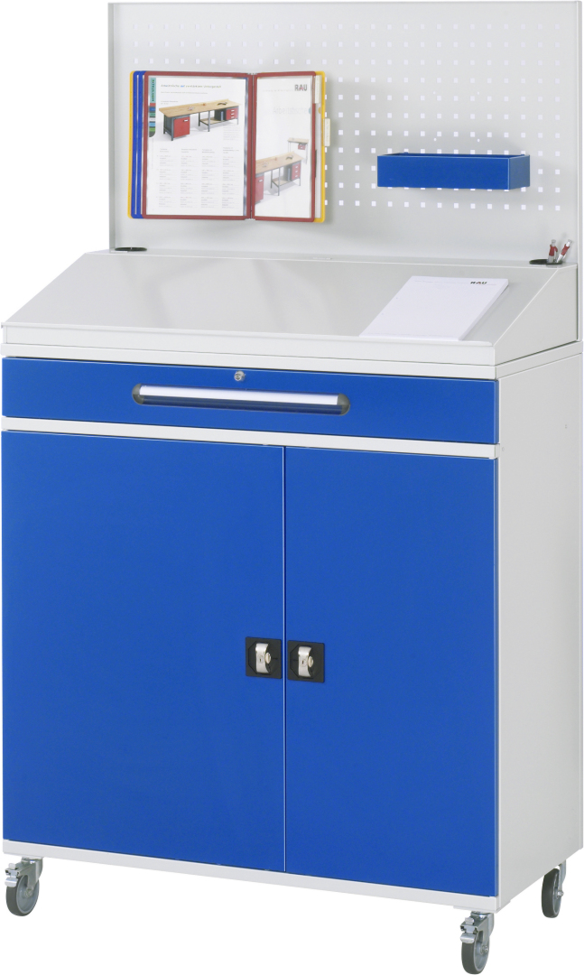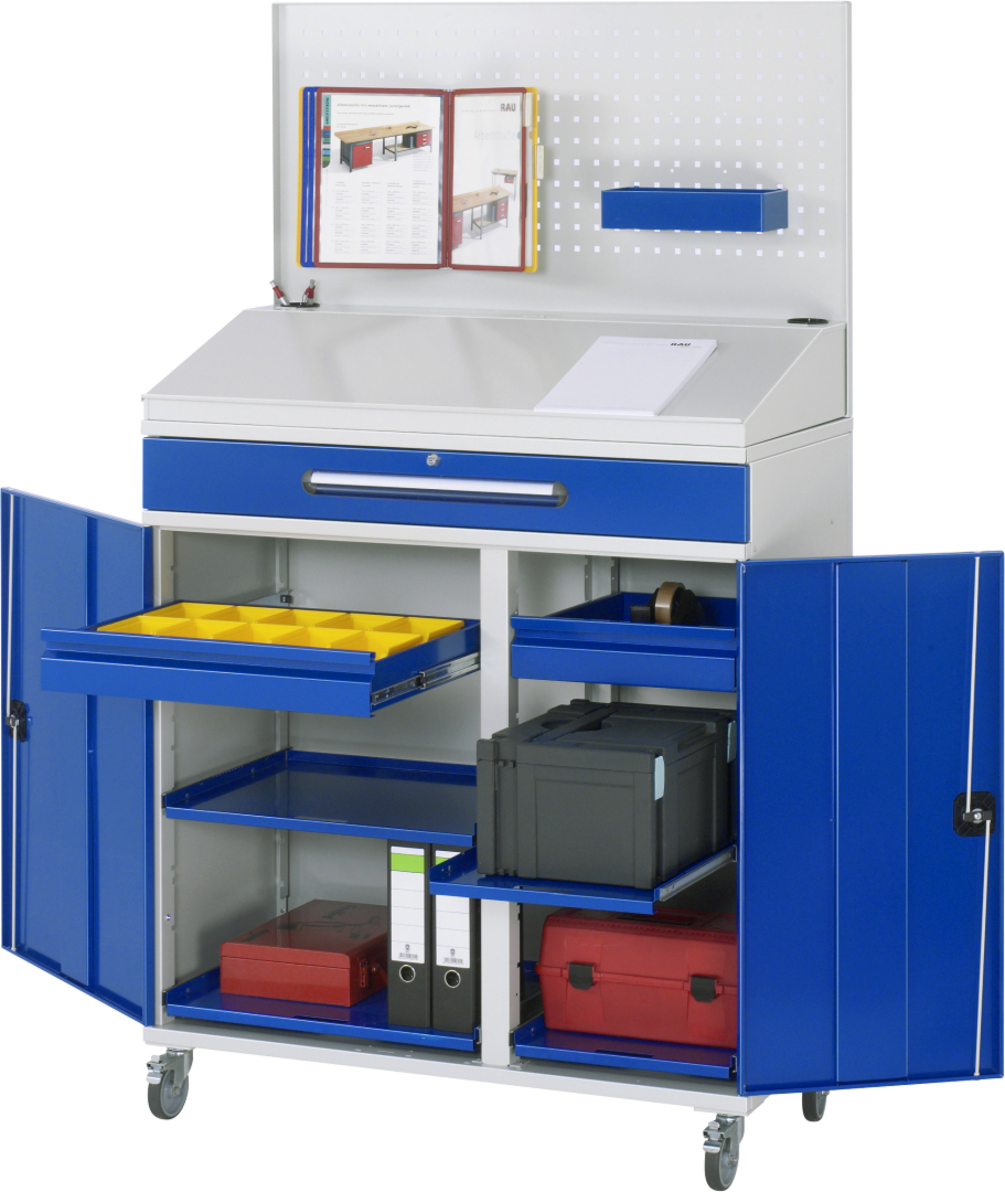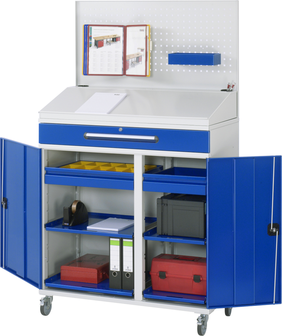 - Basisschrank geteilt in separat nutz- und bedienbares Klein- und Flügeltürfach, inkl. Rollensatz. Rollensatz mit 4 Lenkrollen, davon 2 mit Feststeller (Rollendurchmesser 100 mm, Bauhöhe 120 mm, Laufbelag aus thermoplastischem Gummi (grau, spurlos, 85° Shore), Radkörper aus Polypropylen). Befestigung mit Dreieck-Gewindeplatten. Kabeldurchlässe an der Schrankrückseite, im Deckel sowie im Innenteil.