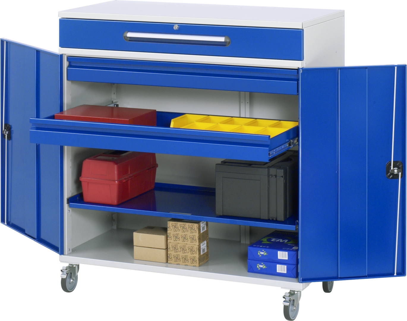 - Basisschrank geteilt in separat nutz- und bedienbares Klein- und Flügeltürfach, inkl. Rollensatz. Rollensatz mit 4 Lenkrollen, davon 2 mit Feststeller (Rollendurchmesser 100 mm, Bauhöhe 120 mm, Laufbelag aus thermoplastischem Gummi (grau, spurlos, 85° Shore), Radkörper aus Polypropylen). Befestigung mit Dreieck-Gewindeplatten. Kabeldurchlässe an der Schrankrückseite, im Deckel sowie im Innenteil.