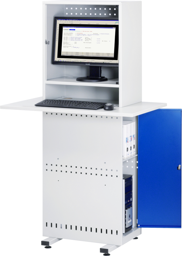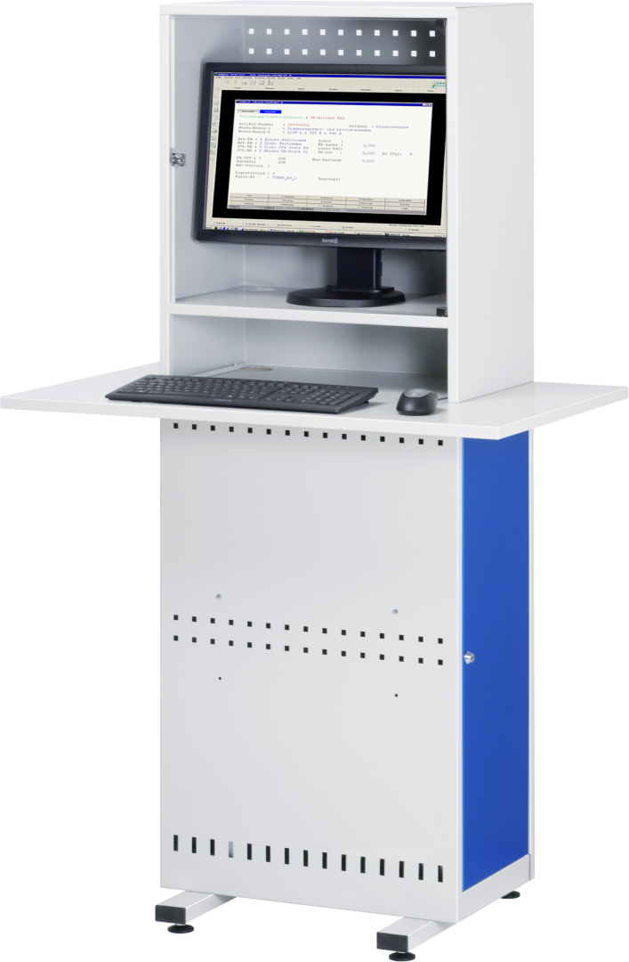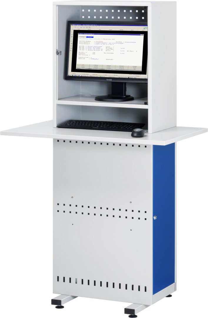- Monitorgehäuse (B600 x T350 x H700 mm) mit abschließbarem Monitorfach (innen B585 x T330 x H540 mm, Sichtfenster B550xH520 mm, integriertes Belüftungsraster) für Bildschirme bis max. 26“ geeignet. Unter dem Monitorfach ist ein offenes Ablagefach.