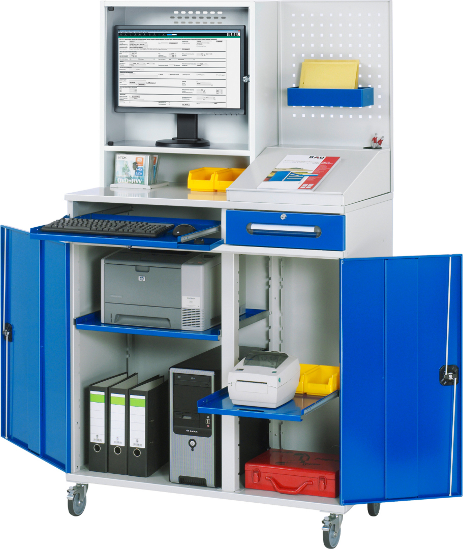 - Basisschrank geteilt in separat nutz- und bedienbares Tastatur-, Klein- und Flügeltürfach, inkl. Rollensatz.Rollensatz mit 4 Lenkrollen, davon 2 mit Feststeller (Rollendurchmesser 100 mm, Bauhöhe 120 mm, Laufbelag aus thermoplastischem Gummi (grau, spurlos, 85° Shore), Radkörper aus Polypropylen). Befestigung mit Dreieck-Gewindeplatten. Kabeldurchlässe an der Schrankrückseite, im Deckel sowie im Innenteil.