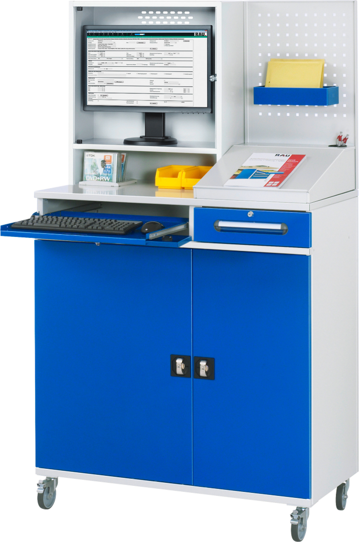 - Tastaturfach links (Höhe 120 mm) mit Frontklappe (abschließbar) und Tastaturauszug. Tastaturauszug B570 x T450 mm zur Tastatur- und Mausauflage (Auszug 80 %, Tragkraft 20 kg, Rastpunkt).