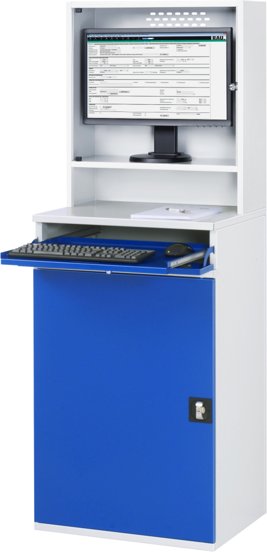 - Tastaturfach (Höhe 120 mm) mit Frontklappe (abschließbar) und Tastaturauszug. Tastaturauszug B570 x T450 mm zur Tastatur- und Mausauflage (Auszug 80 %, Tragkraft 20 kg, Rastpunkt).