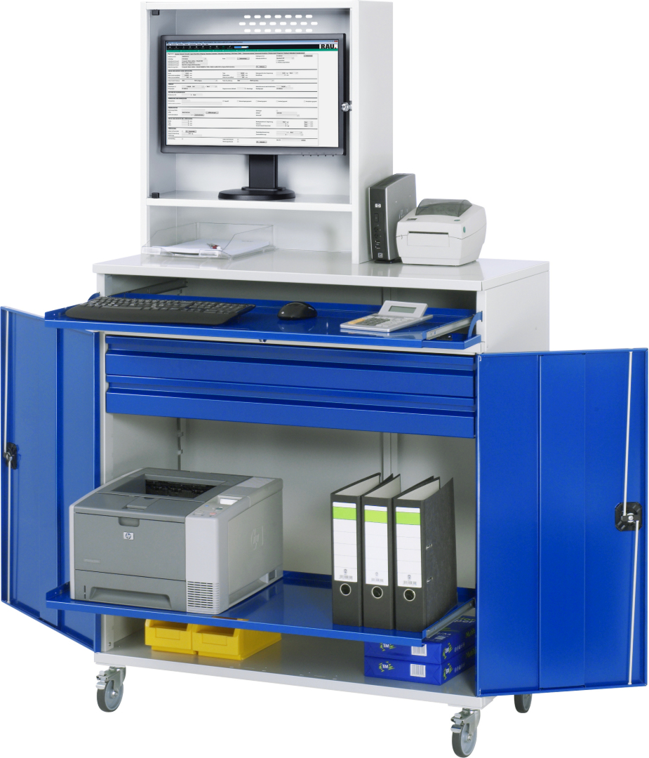 - Basisschrank geteilt in separat nutz- und bedienbares Tastatur- und Flügeltürfach, inkl. Rollensatz. Rollensatz mit 4 Lenkrollen, davon 2 mit Feststeller (Rollendurchmesser 100 mm, Bauhöhe 120 mm, Laufbelag aus thermoplastischem Gummi (grau, spurlos, 85° Shore), Radkörper aus Polypropylen). Befestigung mit Dreieck-Gewindeplatten. Kabeldurchlässe an der Schrankrückseite, im Deckel sowie im Innenteil.