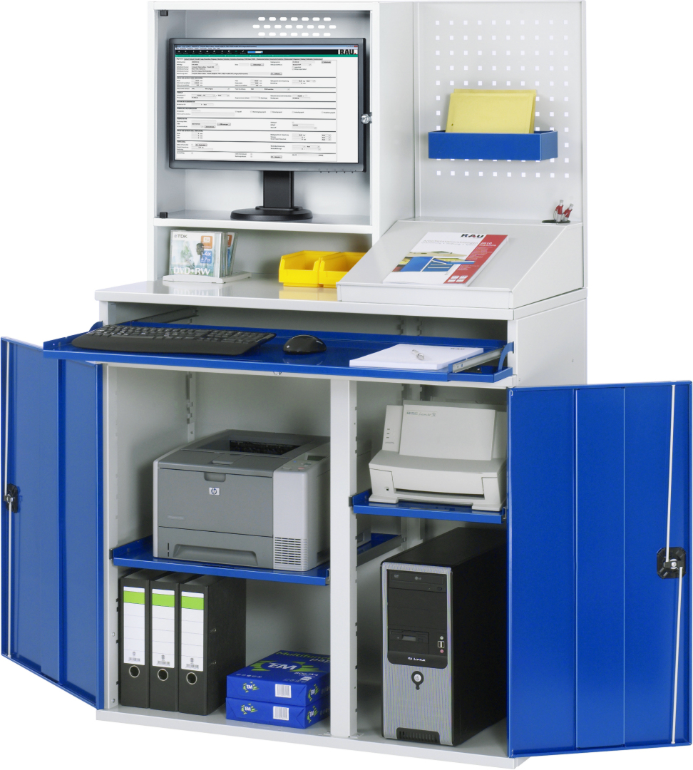 - Tastaturfach(Höhe 120 mm) mit Frontklappe (abschließbar) und Tastaturauszug. Tastaturauszug B1020 x T450 mm zur Tastatur- und Mausauflage (Auszug 80 %, Tragkraft 20 kg, Rastpunkt).