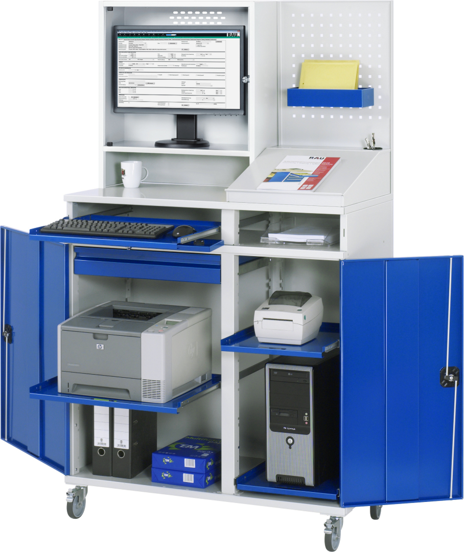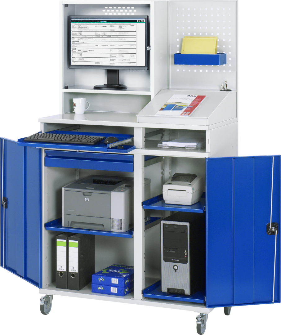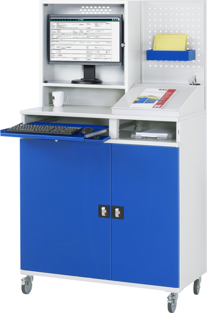 - Basisschrank geteilt in separat nutz- und bedienbares Tastatur- und Flügeltürfach, inkl. Rollensatz. Rollensatz mit 4 Lenkrollen, davon 2 mit Feststeller (Rollendurchmesser 100 mm, Bauhöhe 120 mm, Laufbelag aus thermoplastischem Gummi (grau, spurlos, 85° Shore), Radkörper aus Polypropylen). Befestigung mit Dreieck-Gewindeplatten. Kabeldurchlässe an der Schrankrückseite, im Deckel sowie im Innenteil.