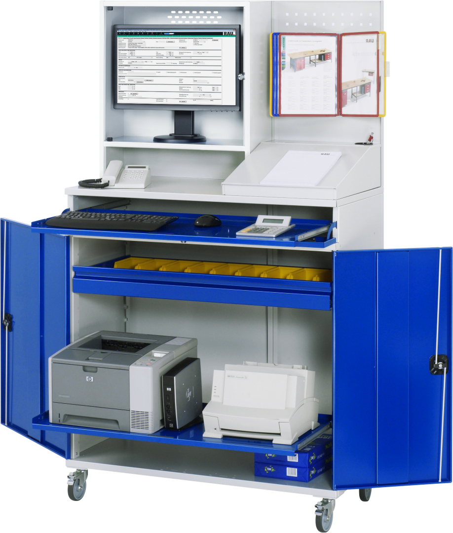 - Basisschrank geteilt in separat nutz- und bedienbares Tastatur- und Flügeltürfach, inkl. Rollensatz. Rollensatz mit 4 Lenkrollen, davon 2 mit Feststeller (Rollendurchmesser 100 mm, Bauhöhe 120 mm, Laufbelag aus thermoplastischem Gummi (grau, spurlos, 85° Shore), Radkörper aus Polypropylen). Befestigung mit Dreieck-Gewindeplatten. Kabeldurchlässe an der Schrankrückseite, im Deckel sowie im Innenteil.