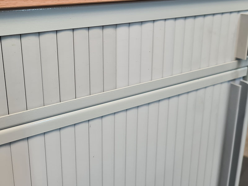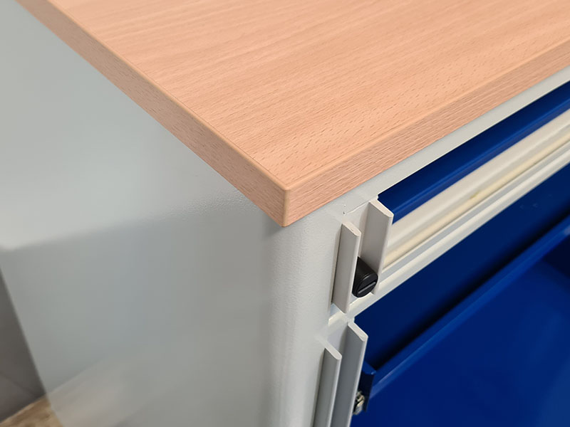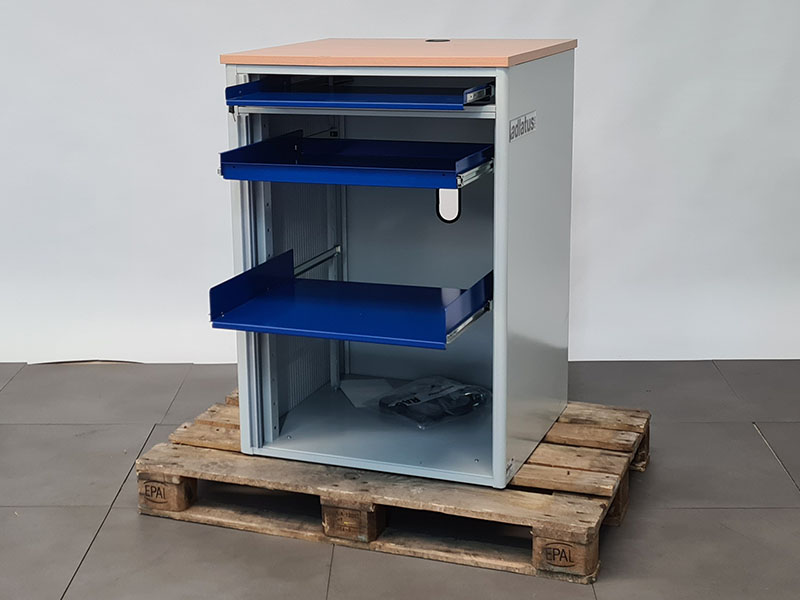 - Basisschrank geteilt in separat nutz- und bedienbares Tastatur- und Hardwarefach. Beide Fächer sind durch einen separaten, vertikal geführten Rollladen verschließbar (Öffnung nach links). Kabeleinlass an der Schrankrückseite sowie Kabeldurchlässe im Boden sowie Innenteil. Rollensatz mit 4 Lenkrollen, davon 2 mit Feststeller (Rollendurchmesser 100 mm, Bauhöhe 120 mm, Laufbelag aus thermoplastischem Gummi (grau, spurlos, 85° Shore), Radkörper aus Polypropylen). Befestigung mit Gewindeplatten.
