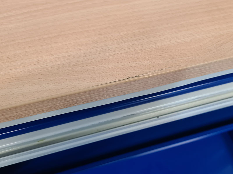 - Buche-Dekor-Arbeitsplatte (Stärke 22 mm). Ober- und Unterseite mit einer Direktbeschichtung. Spritzwasserfest und schmutzresistent. Arbeitsplatte mit Kabeldurchlass.