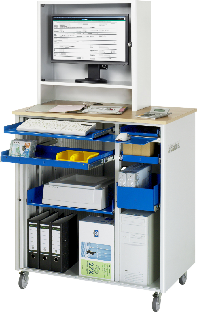 - Basisschrank geteilt in separat nutz- und bedienbares Tastatur- und Hardwarefach. Beide Fächer sind durch einen separaten, vertikal geführten Rollladen (Farbe: RAL7035 Lichtgrau, nach links öffnend) abschließbar. Kabeleinlass an der Schrankrückseite sowie Kabeldurchlässe im Boden sowie Innenteil. Schranksockel (H 80 mm) inkl. Verstellgleiter.