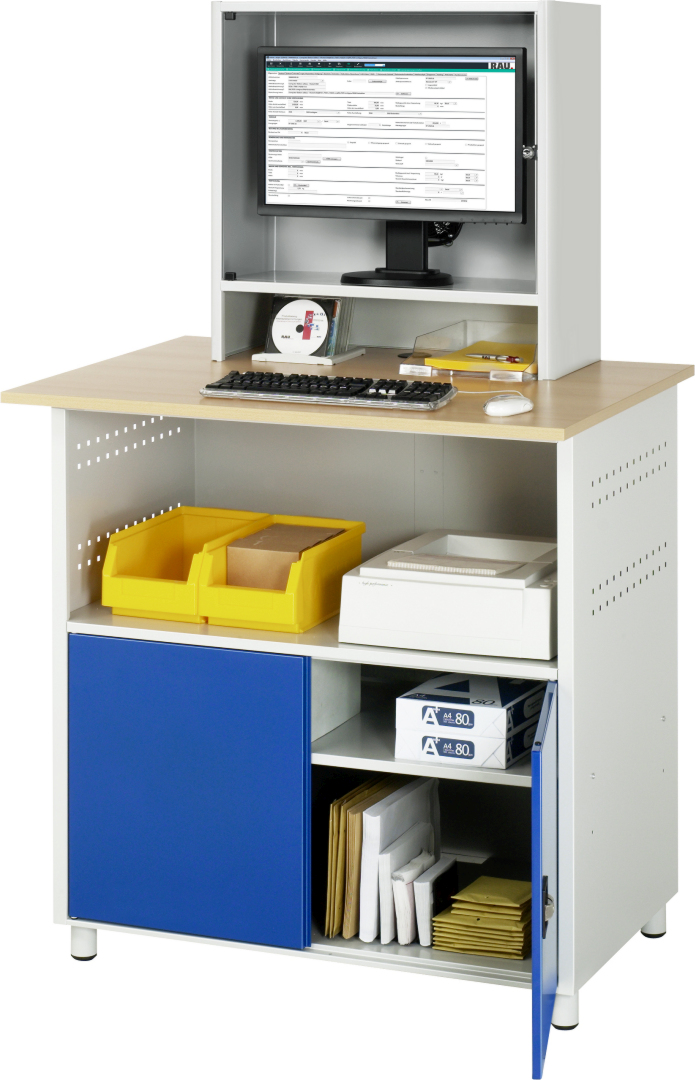 - Basisschrank (B1100xT630xH1035 mm) oben mit offenem Ablagefach (Höhe 415 mm) und unten mit Flügeltürfach (Höhe 550 mm mit Doppel-Flügeltür, Öffnungsweite ca. 100°, abschließbar). Seitenwände links und rechts mit einem Doppel-Lochraster mit 4-Kant Systemlochung (Lochung 10x10 mm, Abstand Lochmitte-Lochmitte 38 mm) zur Aufnahme von Lochplatten-Zubehör (innen und außen nutzbar). Kabeleinlass an der Schrankrückseite sowie Kabeldurchlässe im Innenteil. 4 Standrohre (H 75 mm) inkl. Verstellgleiter.