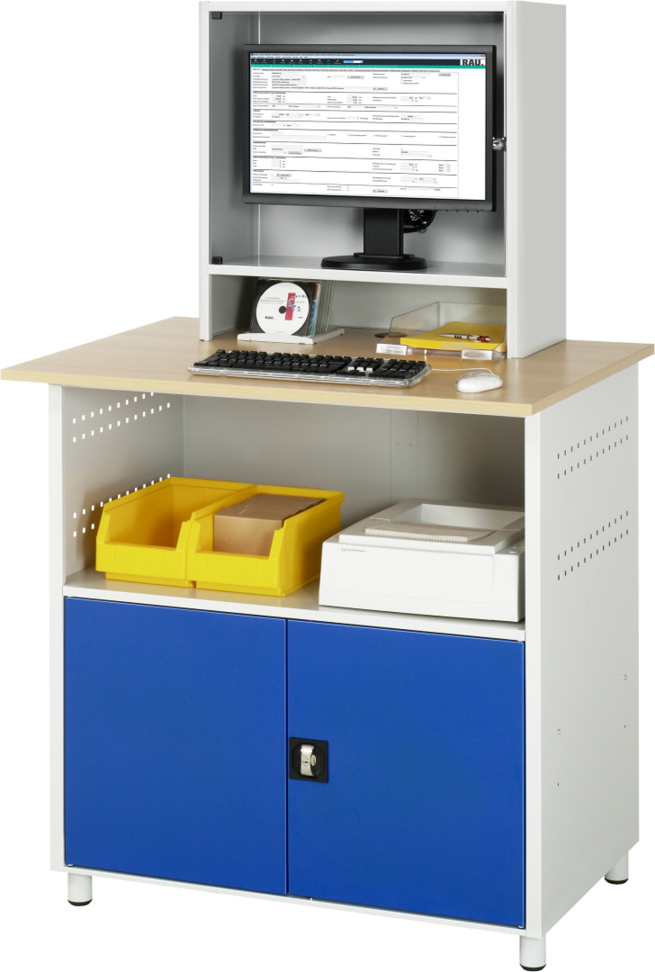 - Monitorgehäuse (B720 x T300 x H710 mm) mit abschließbarem Monitorfach (innen B705 x T280 x H530 mm, integrierter Gerätelüfter) für Bildschirme bis max. 26“ geeignet. Unter dem Monitorfach ist ein offenes Ablagefach (Fachhöhe 140 mm).