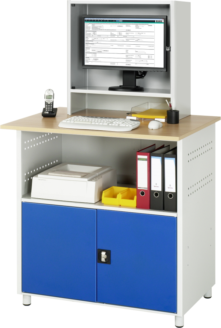 - Basisschrank (B1100xT630xH1035 mm) oben mit offenem Ablagefach (Höhe 415 mm) und unten mit Flügeltürfach (Höhe 550 mm mit Doppel-Flügeltür, Öffnungsweite ca. 100°, abschließbar). Seitenwände links und rechts mit einem Doppel-Lochraster mit 4-Kant Systemlochung (Lochung 10x10 mm, Abstand Lochmitte-Lochmitte 38 mm) zur Aufnahme von Lochplatten-Zubehör (innen und außen nutzbar). Kabeleinlass an der Schrankrückseite sowie Kabeldurchlässe im Innenteil. Rollensatz mit 4 Lenkrollen, davon 2 mit Feststeller (Rollendurchmesser 100 mm, Bauhöhe 125 mm, Laufbelag aus thermoplastischem Gummi (grau, spurlos, 85° Shore), Radkörper aus Polypropylen). Befestigung mit Gewindeplatten.