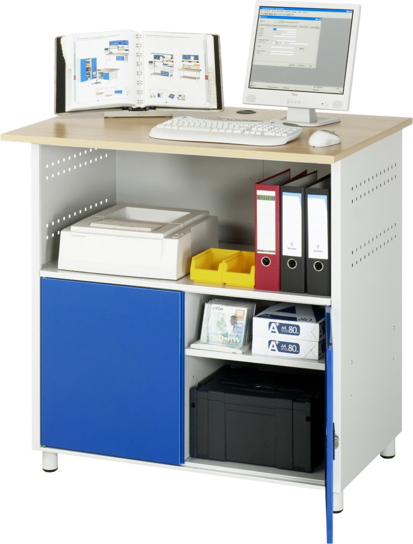 - Basisschrank (B1100xT630xH1035 mm) oben mit offenem Ablagefach (Höhe 415 mm) und unten mit Flügeltürfach (Höhe 550 mm mit Doppel-Flügeltür, Öffnungsweite ca. 100°, abschließbar). Seitenwände links und rechts mit einem Doppel-Lochraster mit 4-Kant Systemlochung (Lochung 10x10 mm, Abstand Lochmitte-Lochmitte 38 mm) zur Aufnahme von Lochplatten-Zubehör (innen und außen nutzbar). Kabeleinlass an der Schrankrückseite sowie Kabeldurchlässe im Innenteil. Rollensatz mit 4 Lenkrollen, davon 2 mit Feststeller (Rollendurchmesser 100 mm, Bauhöhe 125 mm, Laufbelag aus thermoplastischem Gummi (grau, spurlos, 85° Shore), Radkörper aus Polypropylen). Befestigung mit Gewindeplatten.
