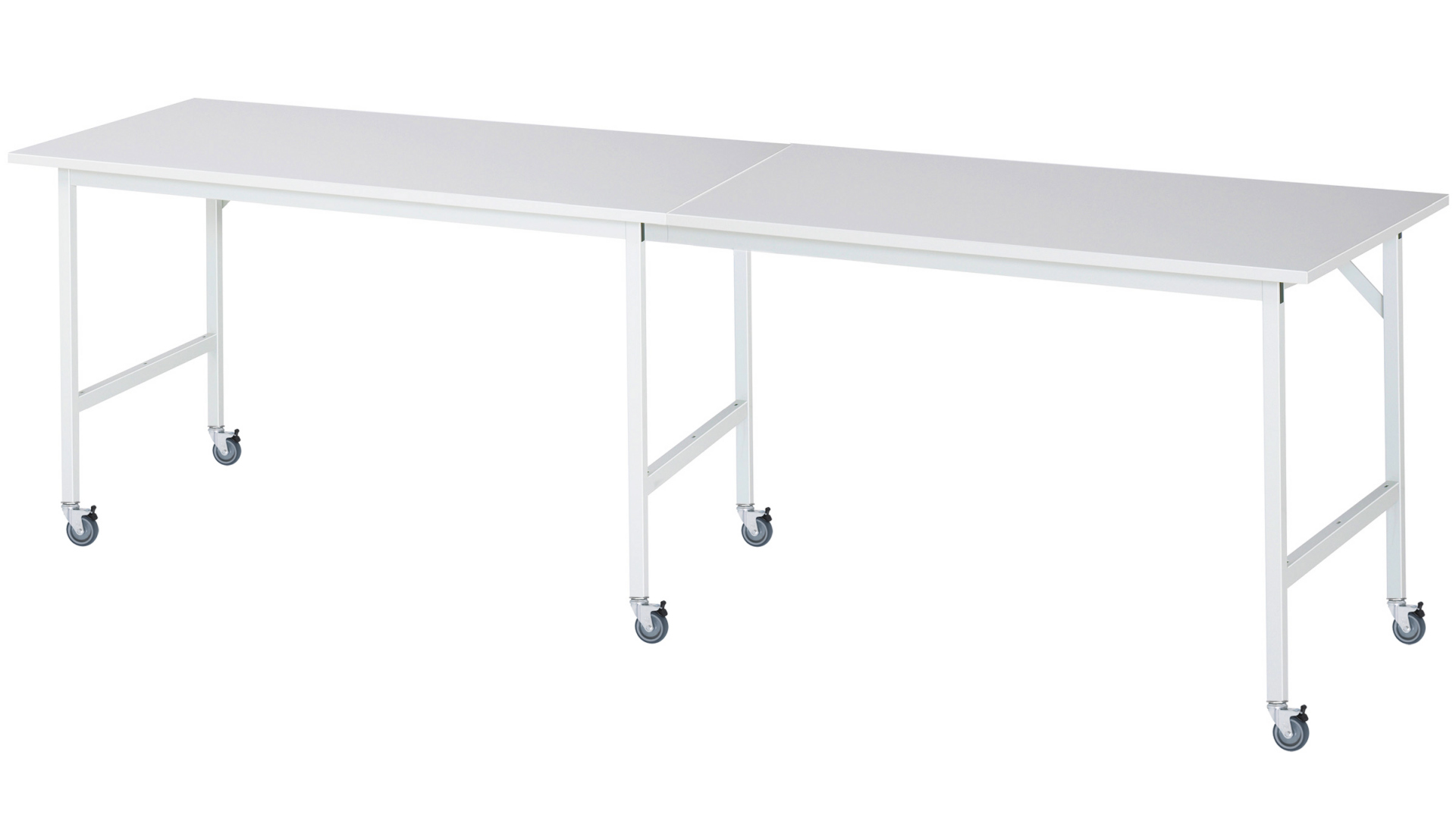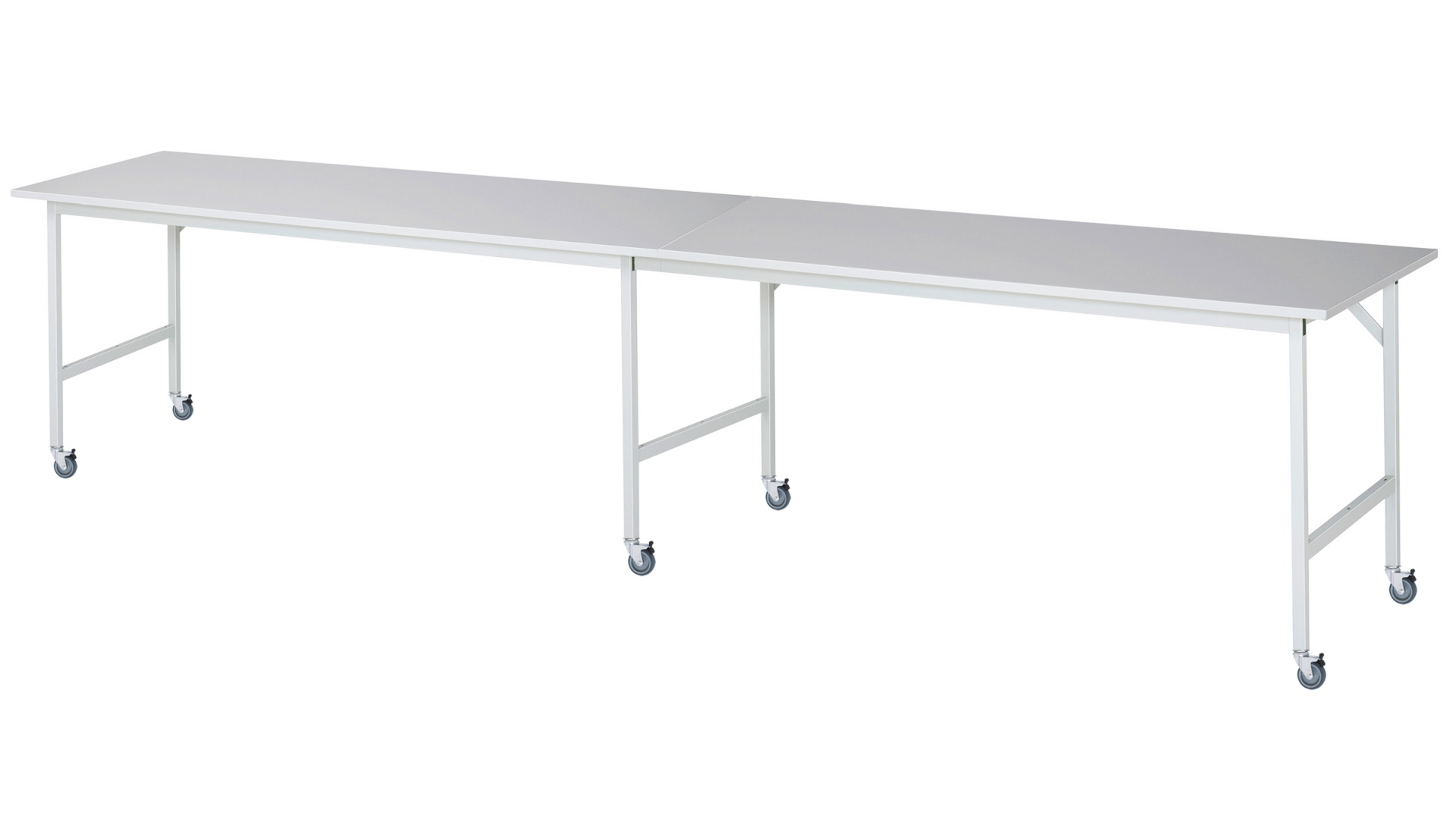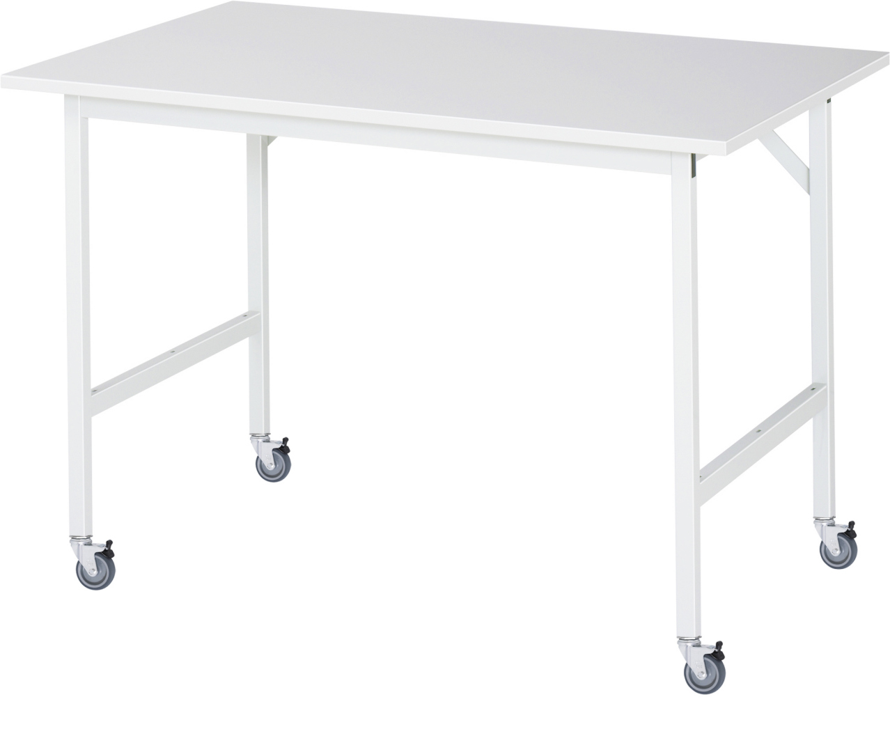 - 4-Fuß Gestell mit zwei Gestellfußpaaren aus Profil-Stahlrohr (30x30x2 mm) inkl. Tiefenverstrebungen (oben und unten). Gestellfüße mit 4 Lenkrollen mit Feststeller inkl. Expanderbefestigung für Profil-Stahlrohr (Rollendurchmesser 80 mm, Bauhöhe 100 mm, Laufbelag aus thermoplastischem Gummi (grau, spurlos, 85° Shore), Radkörper aus Polypropylen). Querstreben aus Profil-Stahlrohr (50x25x2 mm) oben unter der Arbeitsplatte (vorne und hinten). Aussteifungstraversen hinten (links, mittig und rechts) als Verbindung zwischen Gestellfußpaar und hinterer Querstrebe.