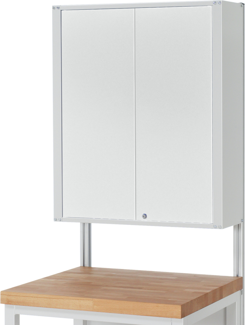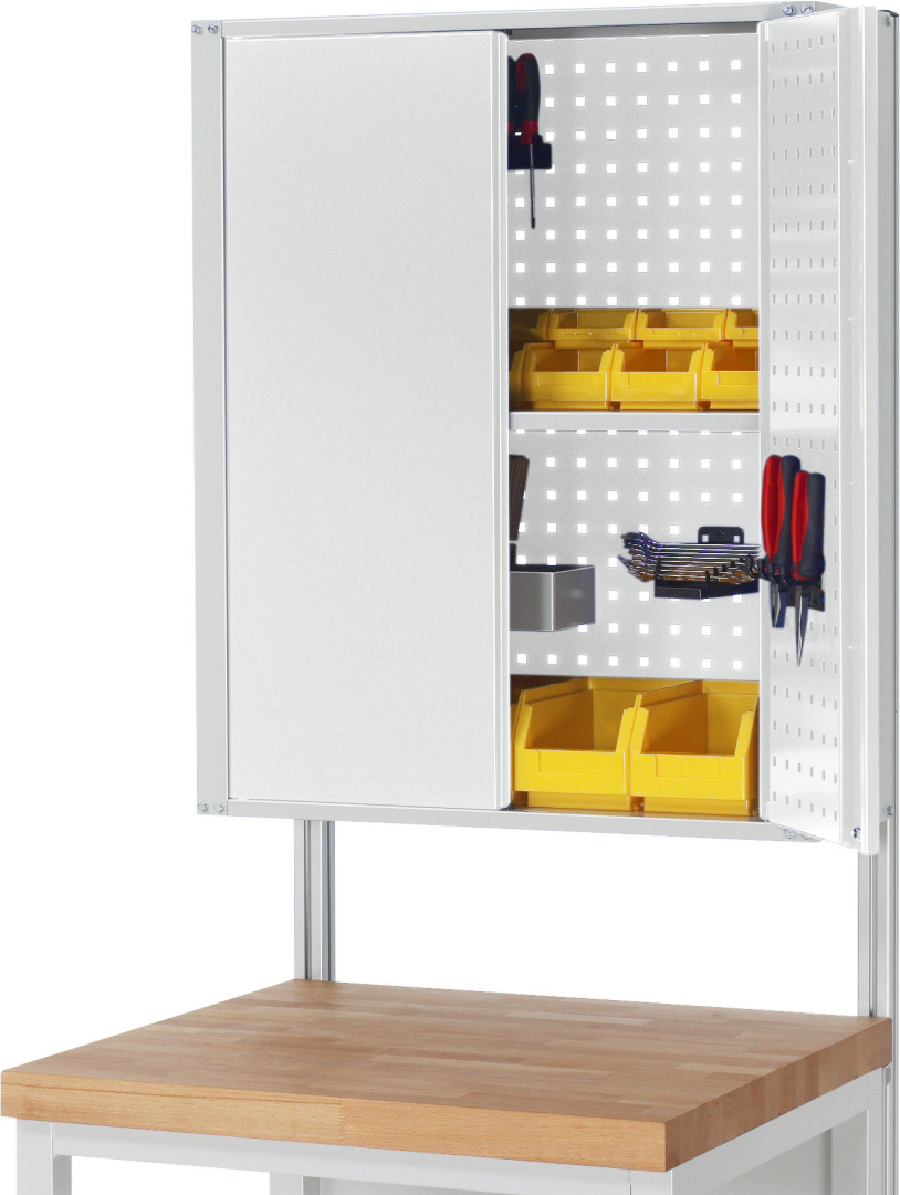 - 2 Türen (abschließbar) mit innen angebrachten Lochplatten. Die Rückwand besteht aus 2 Lochplatten. 1 verstellbarer Fachboden.