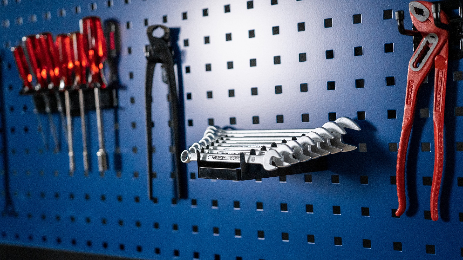 - Halterset, bestehend aus: 5 x Einfach-Haken T 75 mm, 3 x Doppel-Haken T 50 mm, 5 x Einfach-Halter T 35 mm, 2 x U-Halter T 20 mm, 1 x Rohr-Halter Ø 60 mm, 1 x Bohrer- und Innensechskanthalter für 14 Teile, 1 x Schraubendreherhalter für 6 Teile.