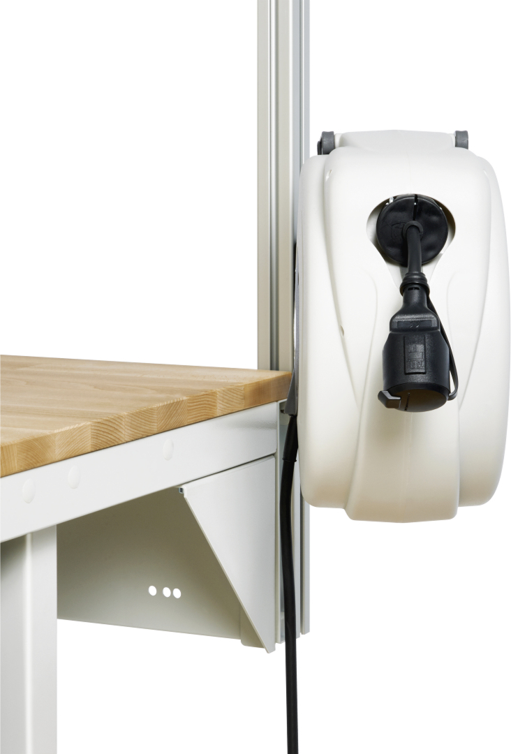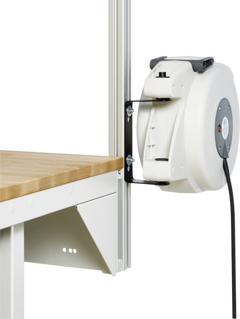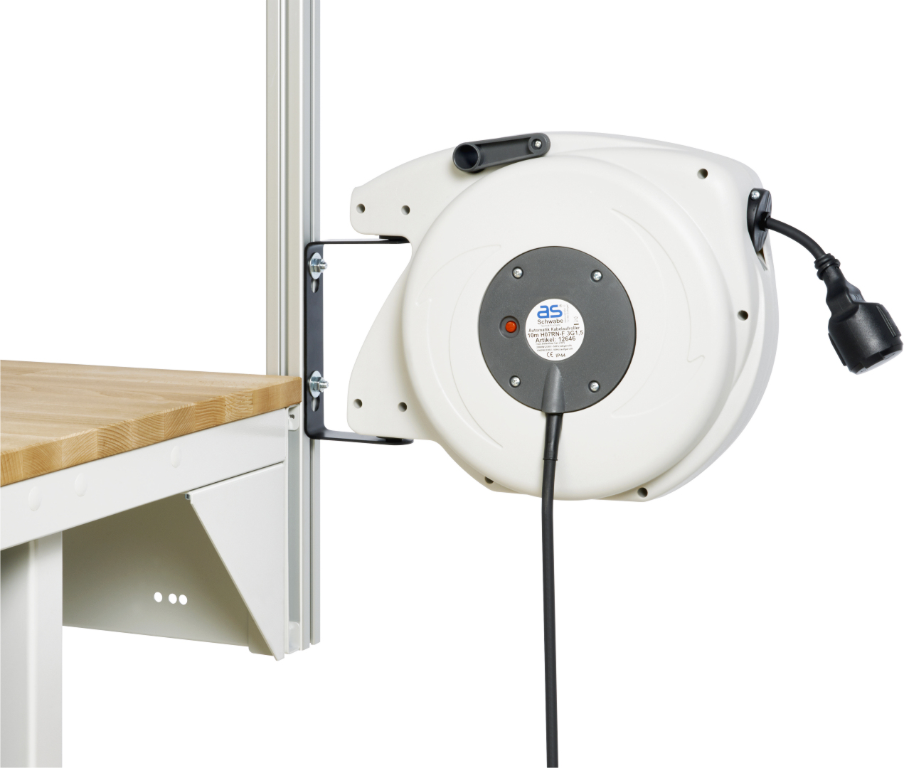 - Automatischer Kabelaufroller mit komfortabel schwenkbarer Wandbefestigung/Systemstützenbefestigung und Möglichkeit zur Abnahme des Aufrollers für den mobilen Einsatz.