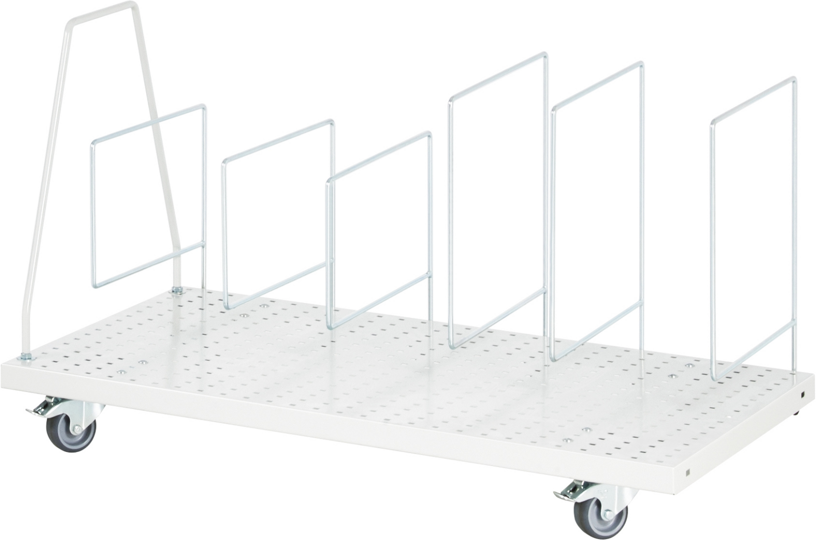 - 4 Lenkrollen mit Feststeller. Rollendurchmesser 80 mm, Bauhöhe 105 mm, Laufbelag aus thermoplastischem Gummi (grau, spurlos, 85° Shore), Radkörper aus Polypropylen.