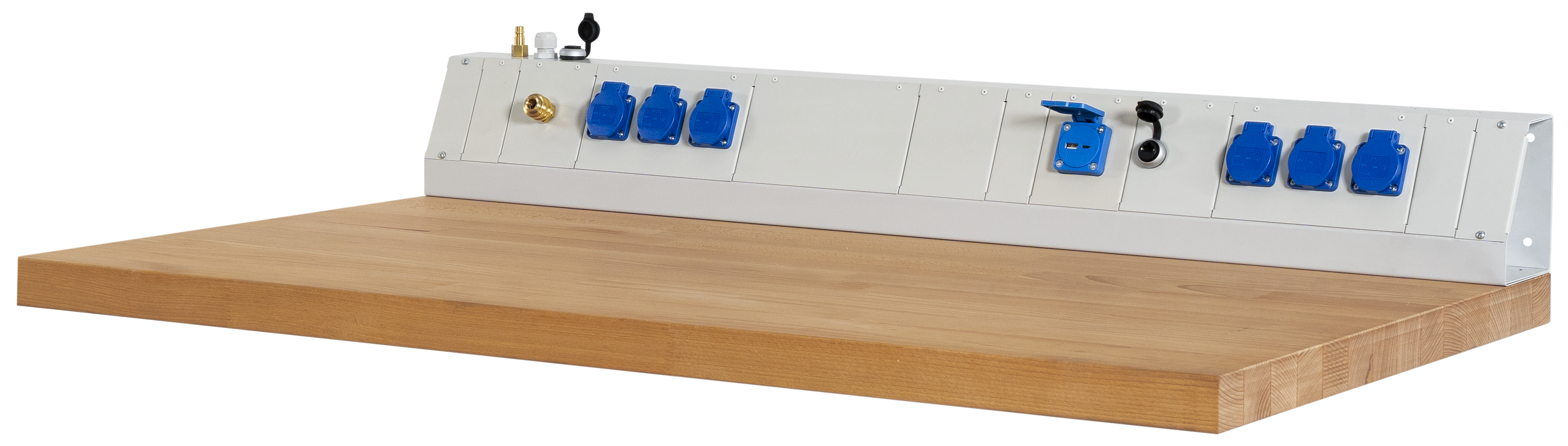 - Medienkanal inklusive Anschlussleitung 09-AL230V (beinhaltet 3-poliges Anschlusskabel mit Stecker für Land/Stecker: Deutschland / Typ F) sowie Vorbereitung für Zuführung von Luft und Datenleitung. Die Anschlussleitung und Zuführungen werden serienmäßig oben links eingebaut, können nach Wunsch auch seitlich links oder rechts, oder oben rechts eingebaut werden. Kabelquerschnitt je Ader 1,5 mm², Gesamtbelastung bis 3,6 kW.